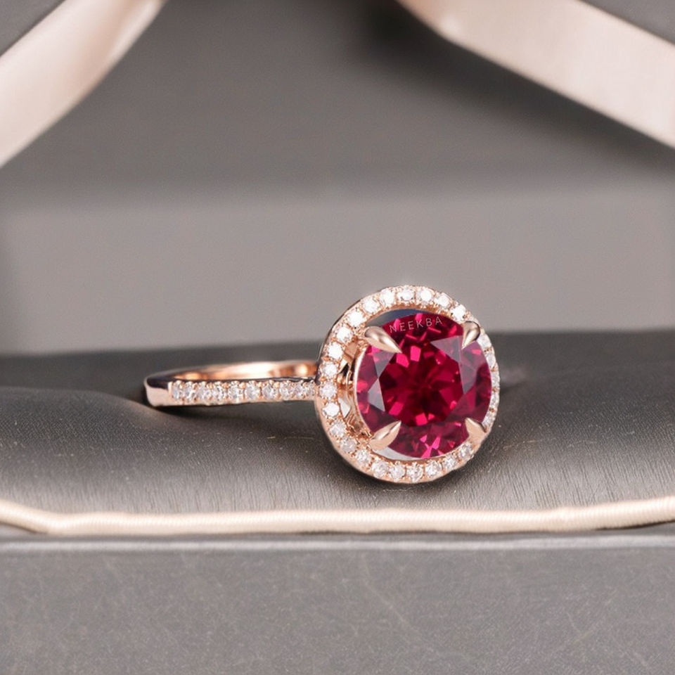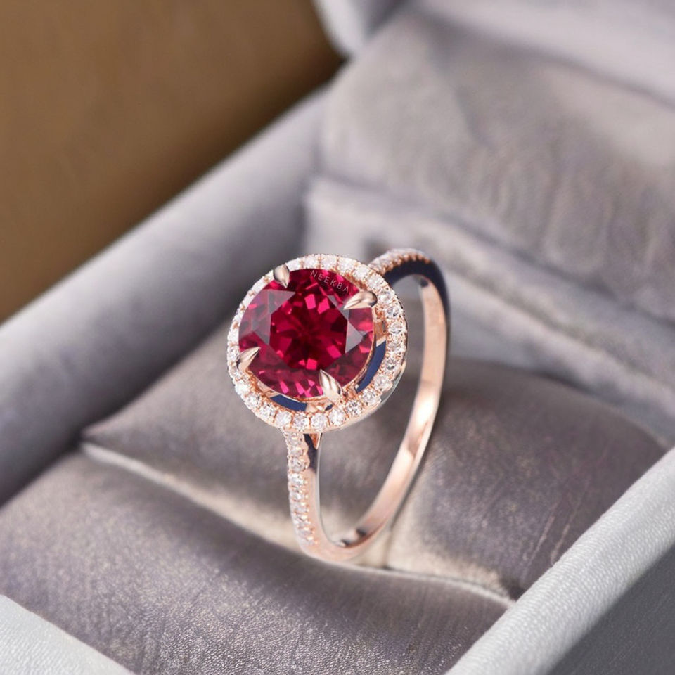 แหวนทับทิมทรงกลมสีทอง10K สำหรับงานแต่งงานและงานหมั้นตกแต่งแบบอาร์ตเดคโคพร้อมแหวนประดับอัญมณี