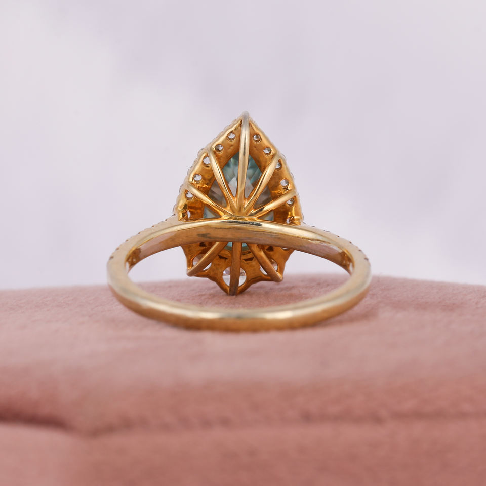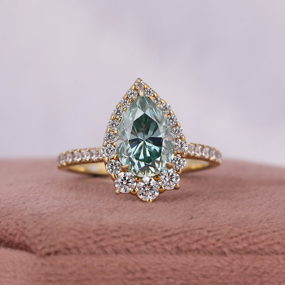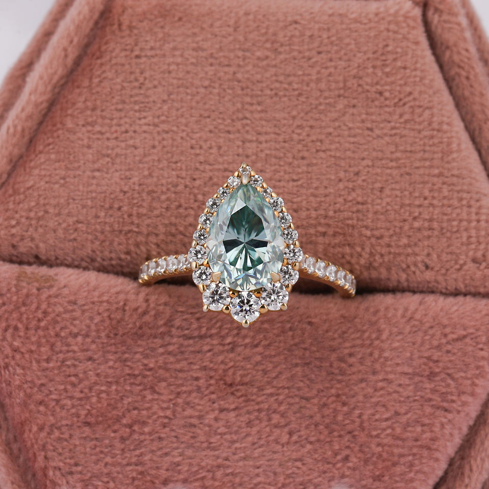 แหวนหมั้น10KT สีทองหรูหราสำหรับผู้หญิงแหวนตัดเพชรลูกแพร์สีฟ้ารัศมีคลาสสิกการตั้งค่าเพชรห้องแล็บสร้างขึ้น-ได้รับการรับรอง IGI