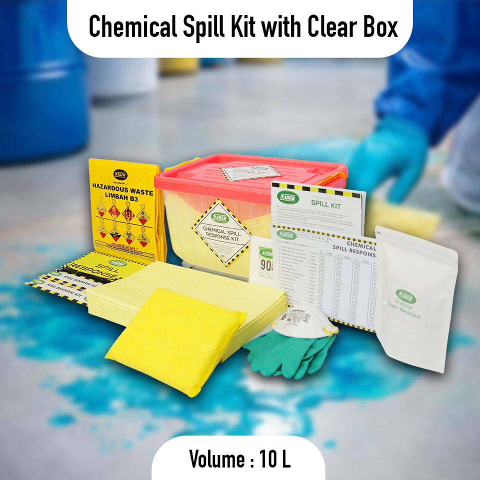 ชุดอุปกรณ์ดูดซับสารเคมีรั่วไหลอเนกประสงค์ ขนาด 10 ลิตร แบบกล่องใส สำหรับสารเคมีเหลว กรด ด่าง ป้องกันการรั่วไหล ควบคุมเหตุฉุกเฉิน ใช้ในห้องปฏิบัติการ เพื่อความปลอดภัย