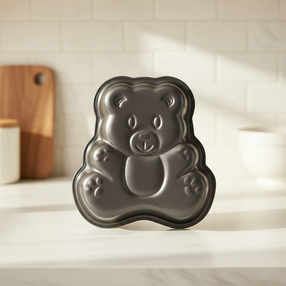 กระทะเค้กรูปหมีขนาด 10 ซม. คุณสมบัติการปล่อยเค้กออกได้ดี และเป็นกระทะอบขนมที่ดีสำหรับงานปาร์ตี้ที่บ้าน