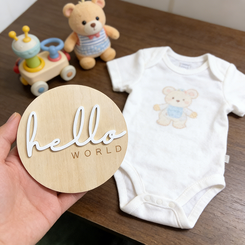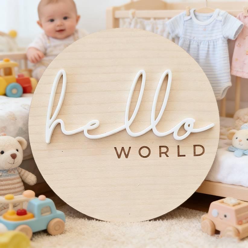 ป้ายไม้สลักชื่อเด็กแบบกลม ขนาด 10 ซม. เป็นมิตรกับสิ่งแวดล้อม พร้อมข้อความ Hello World สำหรับถ่ายรูปเด็กแรกเกิด