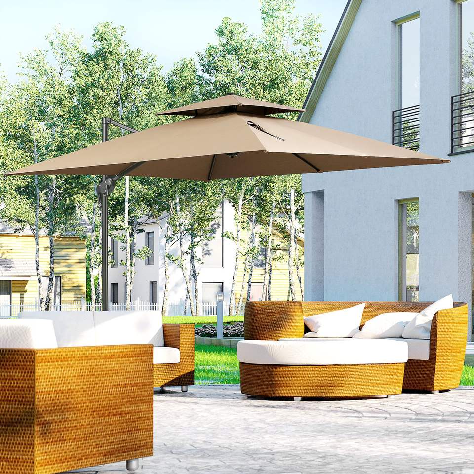 ฐานร่มสนามแบบออฟเซ็ต 10 ฟุต พร้อมโครงอะลูมิเนียมแบบคู่ หมุนได้ 360 องศา ปรับเอียงง่าย 8 ระดับ สำหรับพื้นที่นั่งเล่นกลางแจ้ง