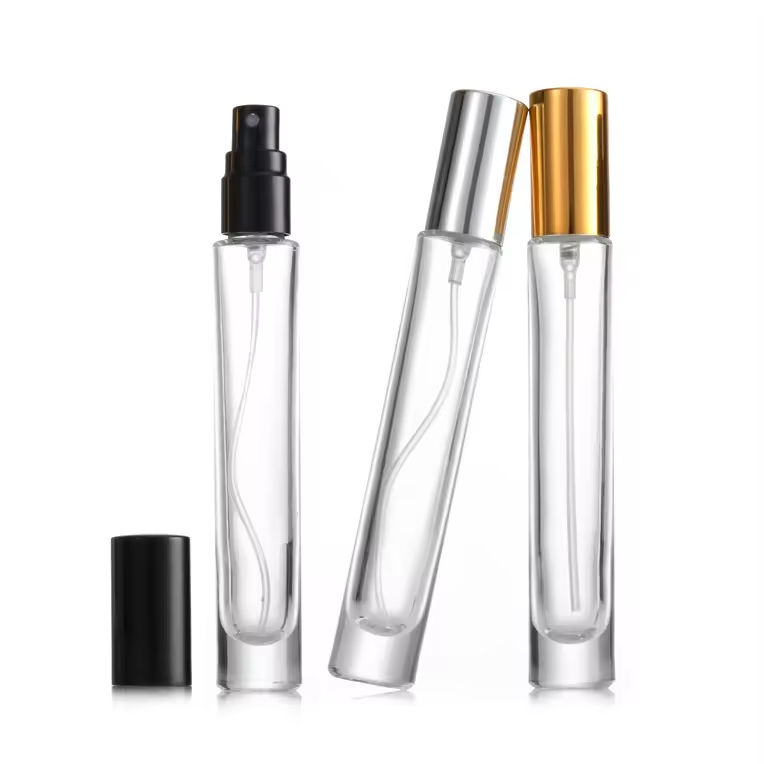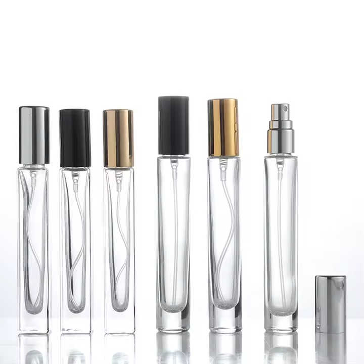 ขวดน้ำหอมแก้วคุณภาพสูงหรูหราขนาด 10 มล. รูปทรงสี่เหลี่ยม/ทรงกลม แบบเติมได้ พร้อมหัวฉีดสเปรย์อะลูมิเนียมและฝาปิด