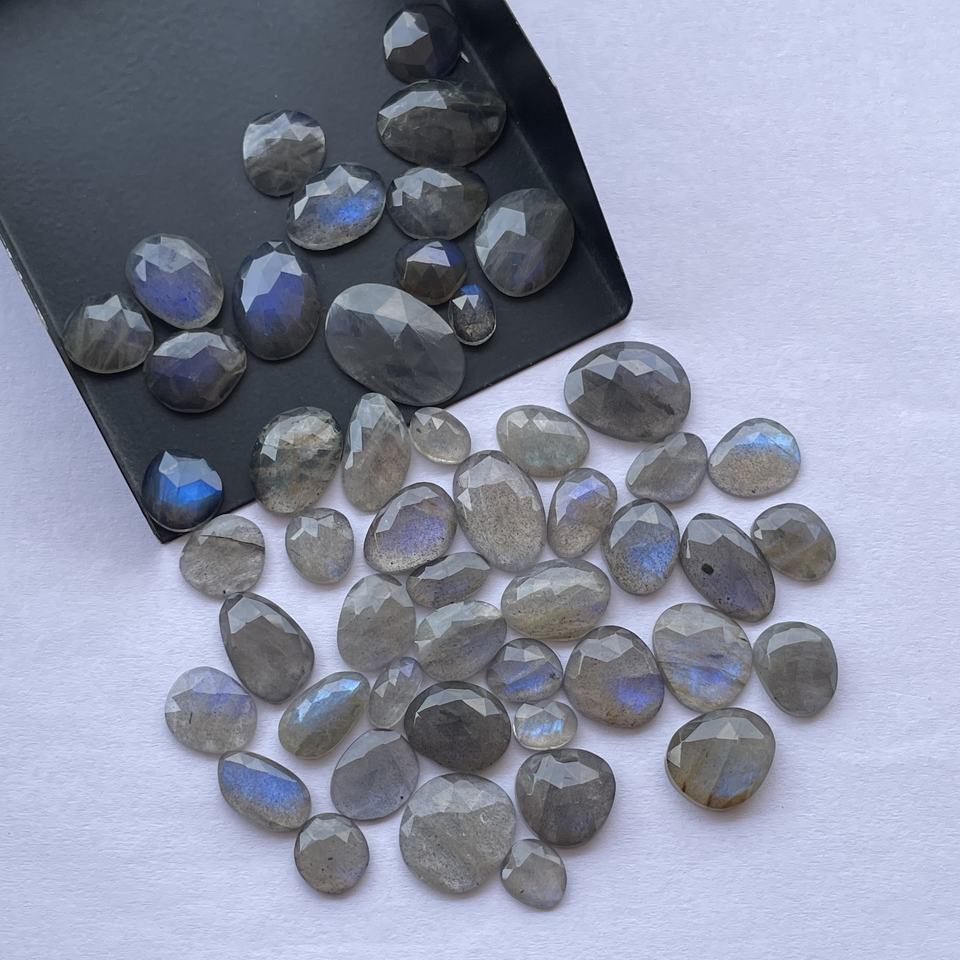 หินลาบราโดไรต์ธรรมชาติ ขนาดฟรีไซส์ เจียระไนเหลี่ยมเพชร ทรงโรสคัท แบบโพลกี้