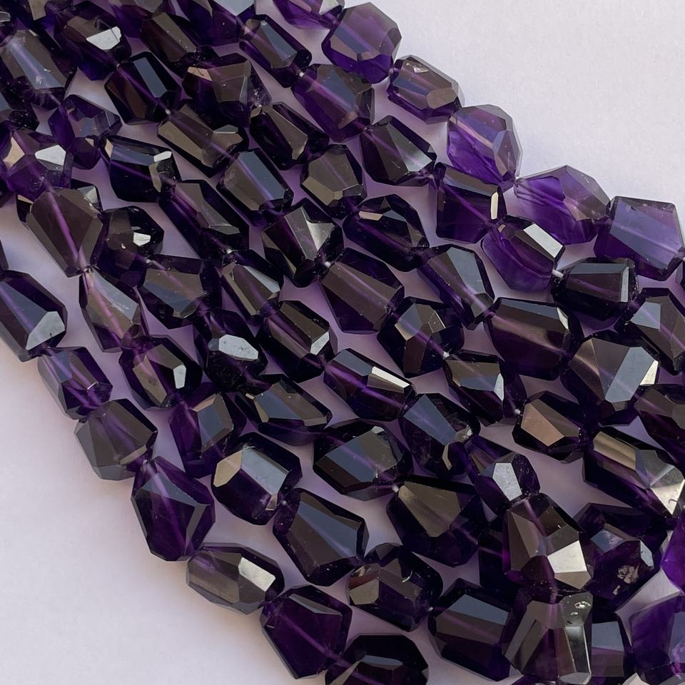 ลูกปัดหินอเมทิสต์แอฟริกันสีม่วงธรรมชาติ เจียระไนเหลี่ยมเพชร รีดผิวเรียบ ร้อยเป็นเส้น