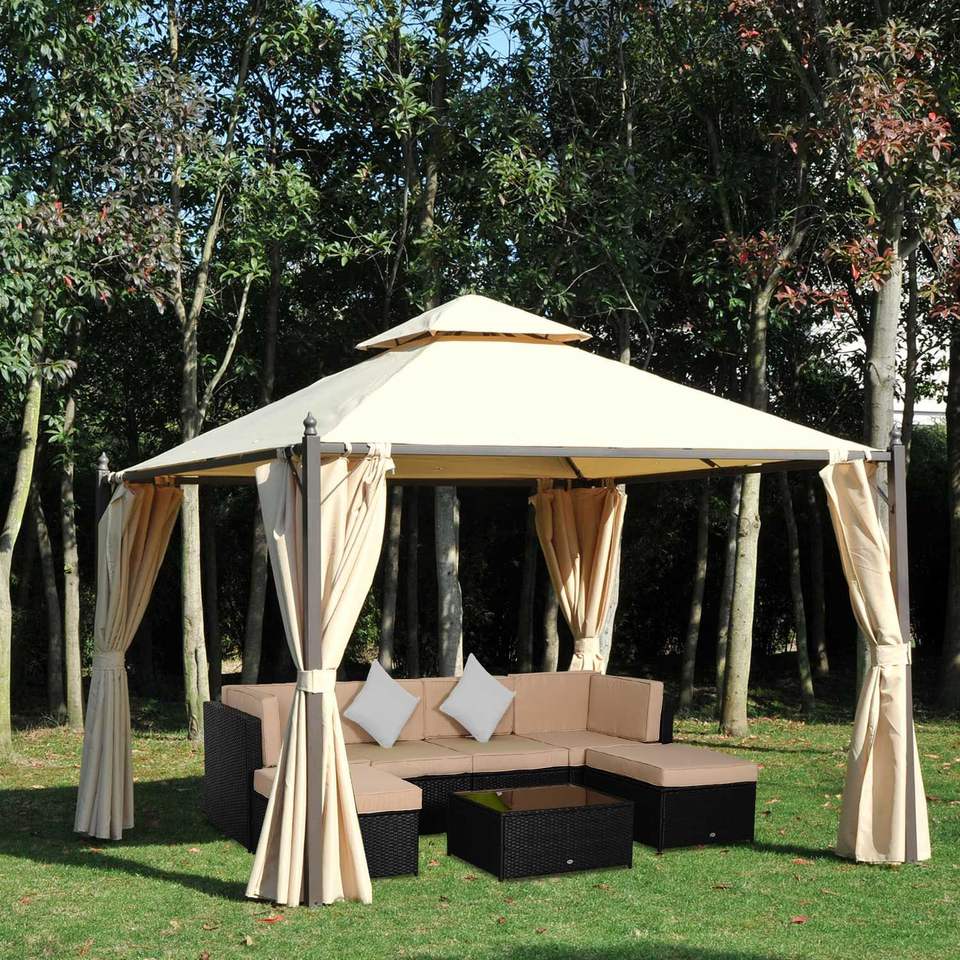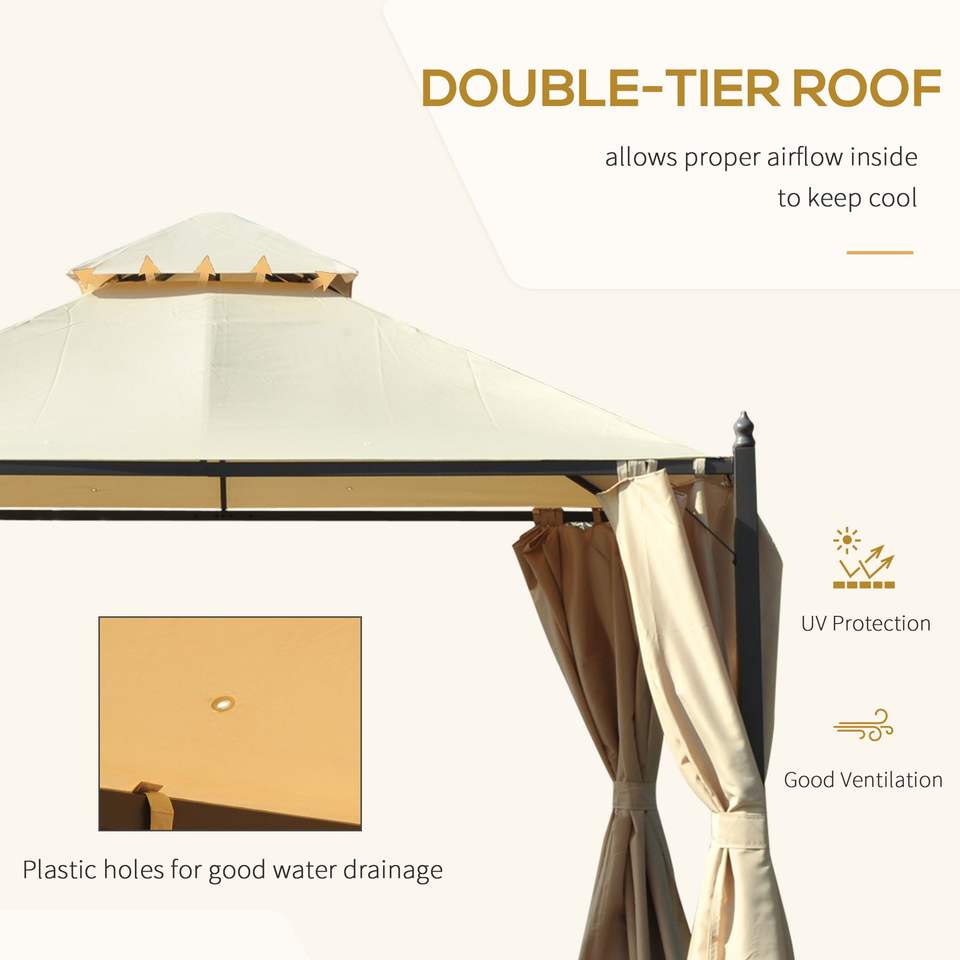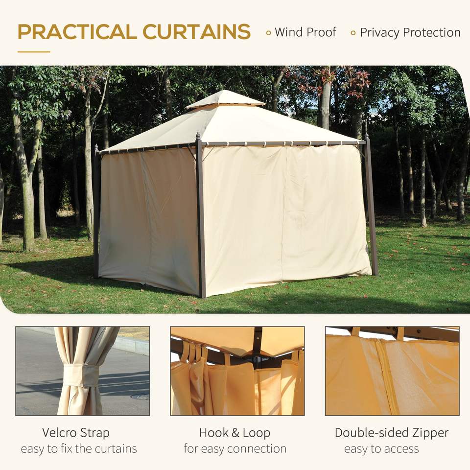 10x10 Beige Steel Vented Roof Gazebo with Polyester Curtains & Mosquito Netting Pavilion or Pergola Design