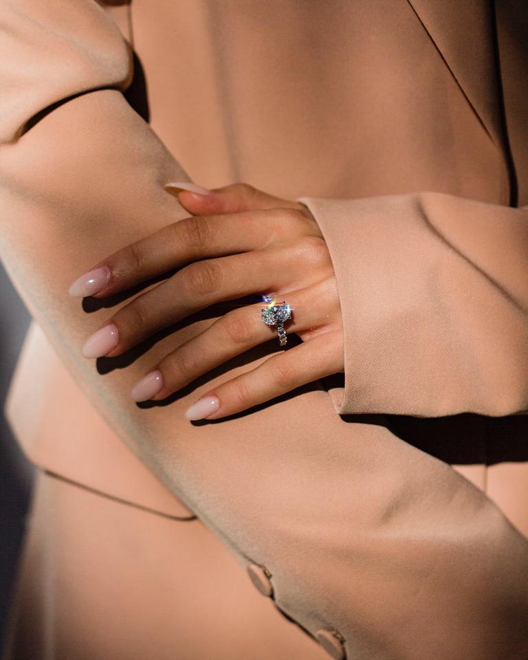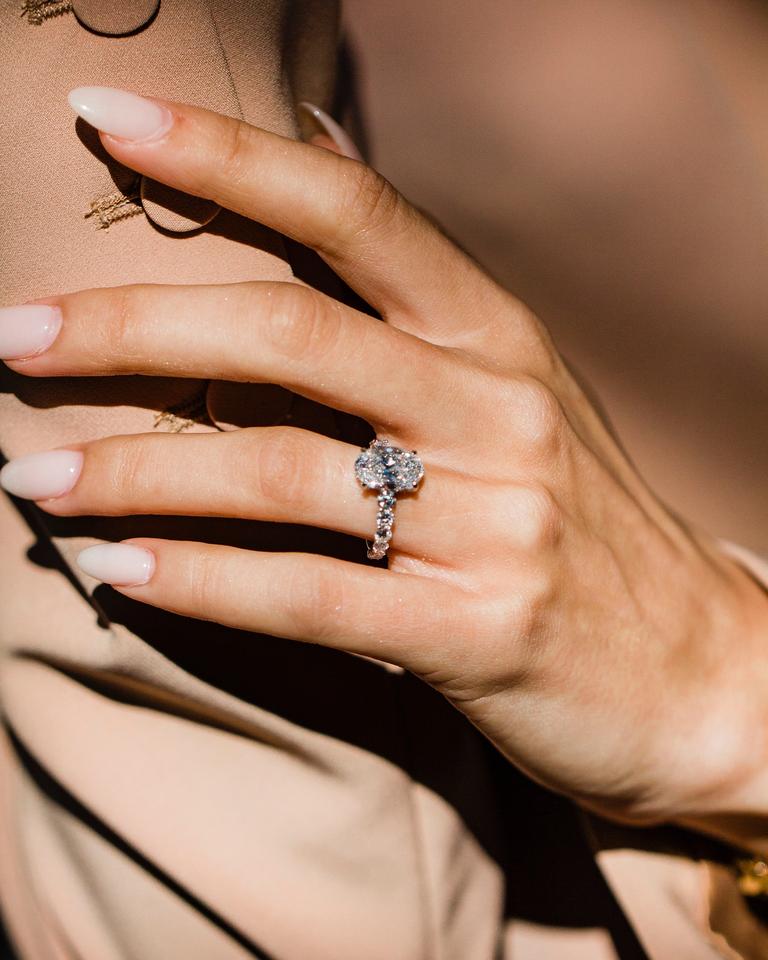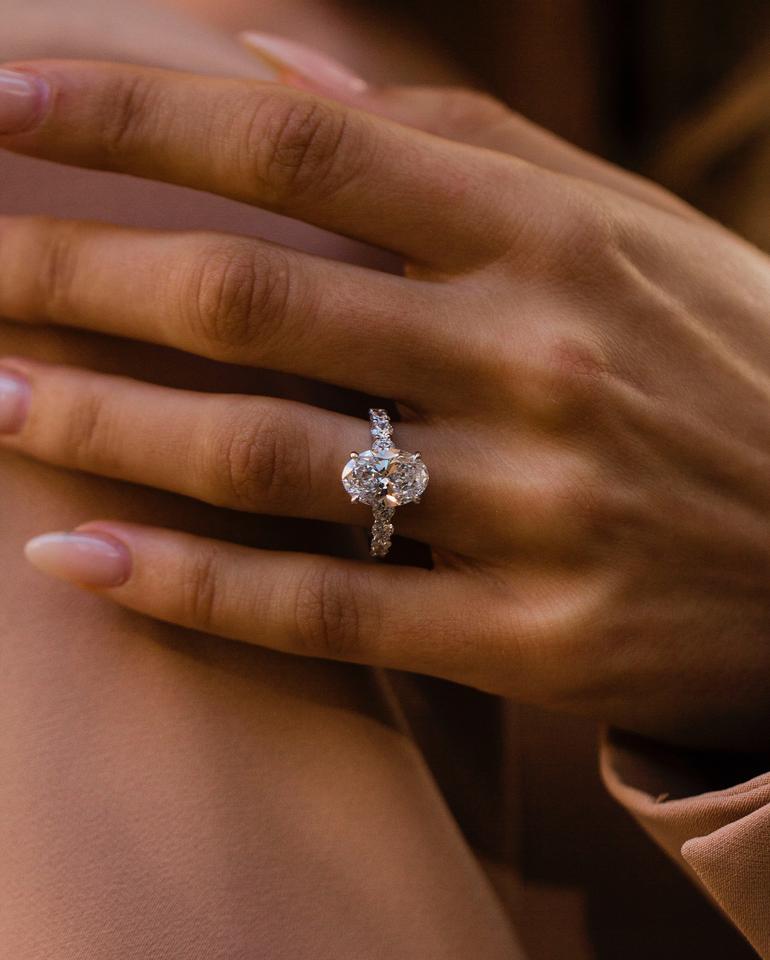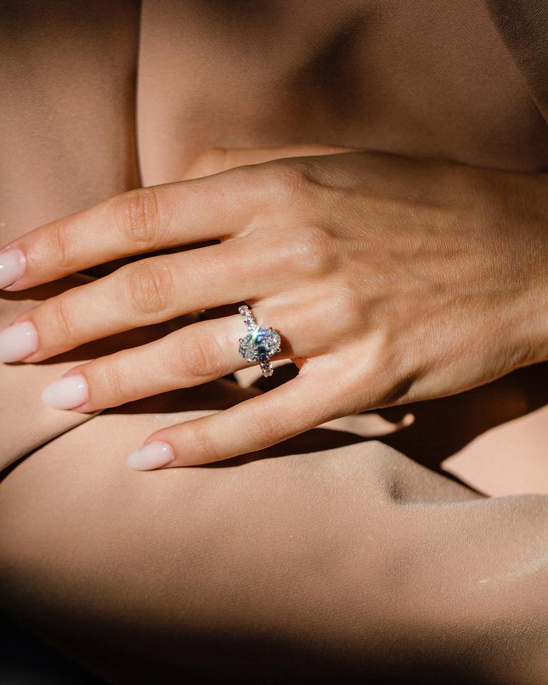 แหวนหมั้นเพชรโมอิสทรงรีตัดขนาด10x8มม. พร้อมวงฮาโลและสายรัดในการตั้งค่าแบบคลาสสิก | เครื่องประดับเจ้าสาวคุณภาพดีสำหรับงานแต่งงาน