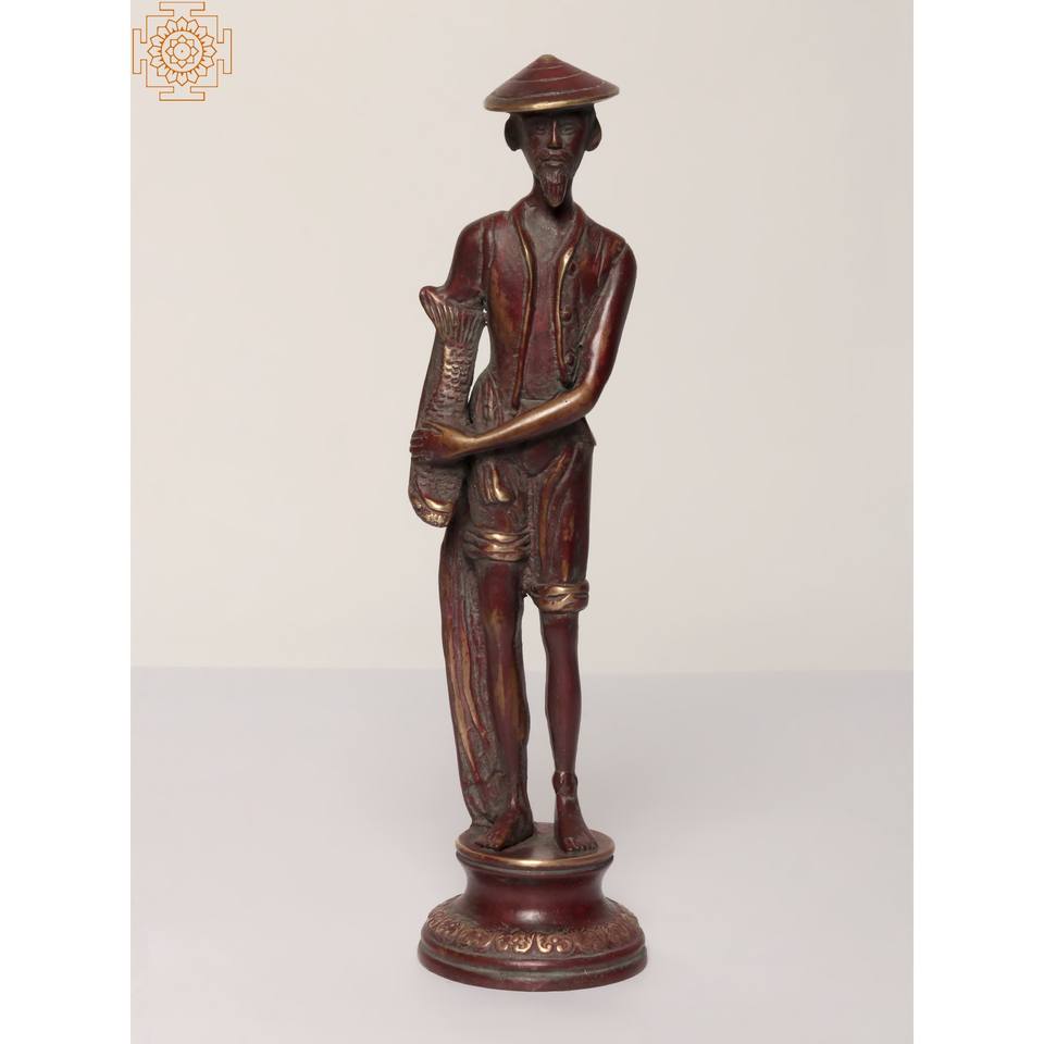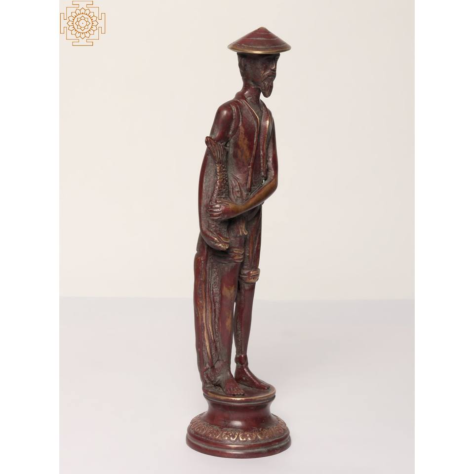 11-Inch Handmade Chinese Fishmonger Brass Statue for Home Decor and Gifting Purpose Made In India