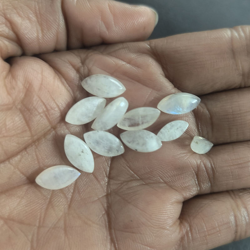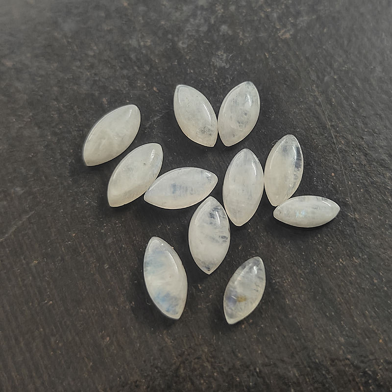 อัญมณี:มูนสโตนสีรุ้ง ทรงมาร์คีส์คาโบชอง ขนาด 10x5 มม. ถึง 12x6 มม.