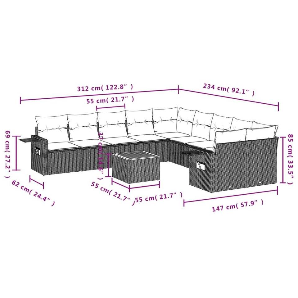 ชุดโซฟาลานบ้านหวายโพลีสีดำ 11 ชิ้นพร้อมเบาะรองนั่งสำหรับชุดสวน