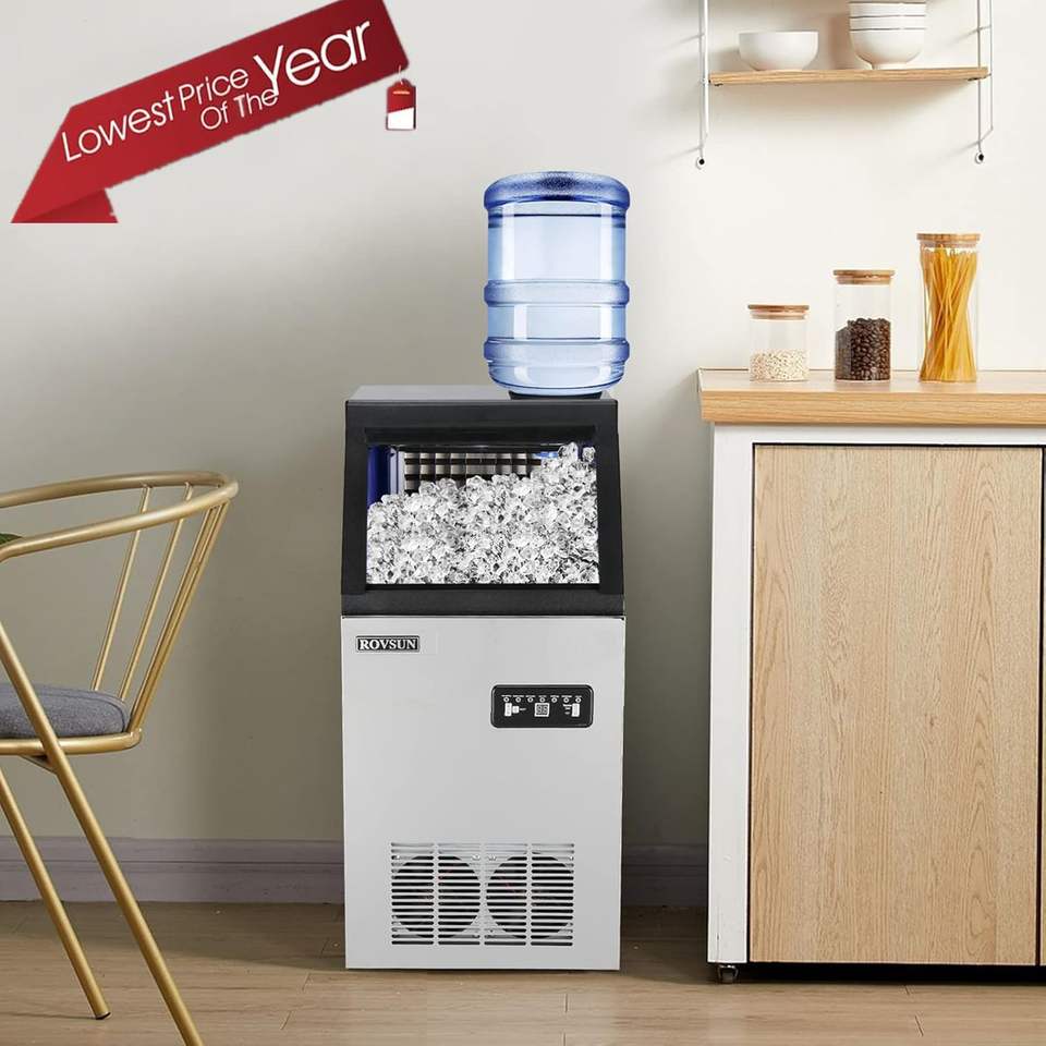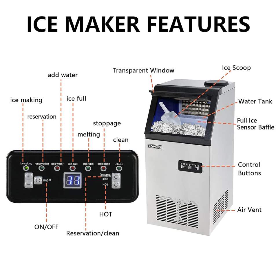เครื่องทำน้ำแข็งเชิงพาณิชย์ขนาด 110 ปอนด์/24 ชม. พร้อมช่องเติมน้ำ 2 ช่อง, เครื่องทำน้ำแข็งแบบตั้งพื้นพร้อมถังเก็บน้ำแข็งขนาด 24 ปอนด์, ที่ตักน้ำแข็ง