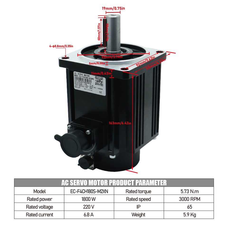 มอเตอร์เซอร์โวแบบเฟสเดียวขนาด 110 มม. เส้นผ่านศูนย์กลางหน้าแปลน 19 มม. แรงดันไฟฟ้า 220V ความเร็วรอบ 3000 รอบต่อนาที แรงบิด 5.73 นิวตันเมตร กระแสไฟ 6.8 แอมป์ กำลังไฟ 1.8 กิโลวัตต์ ระดับการป้องกัน IP65 พร้อมชุดขับเคลื่อน Ethercat