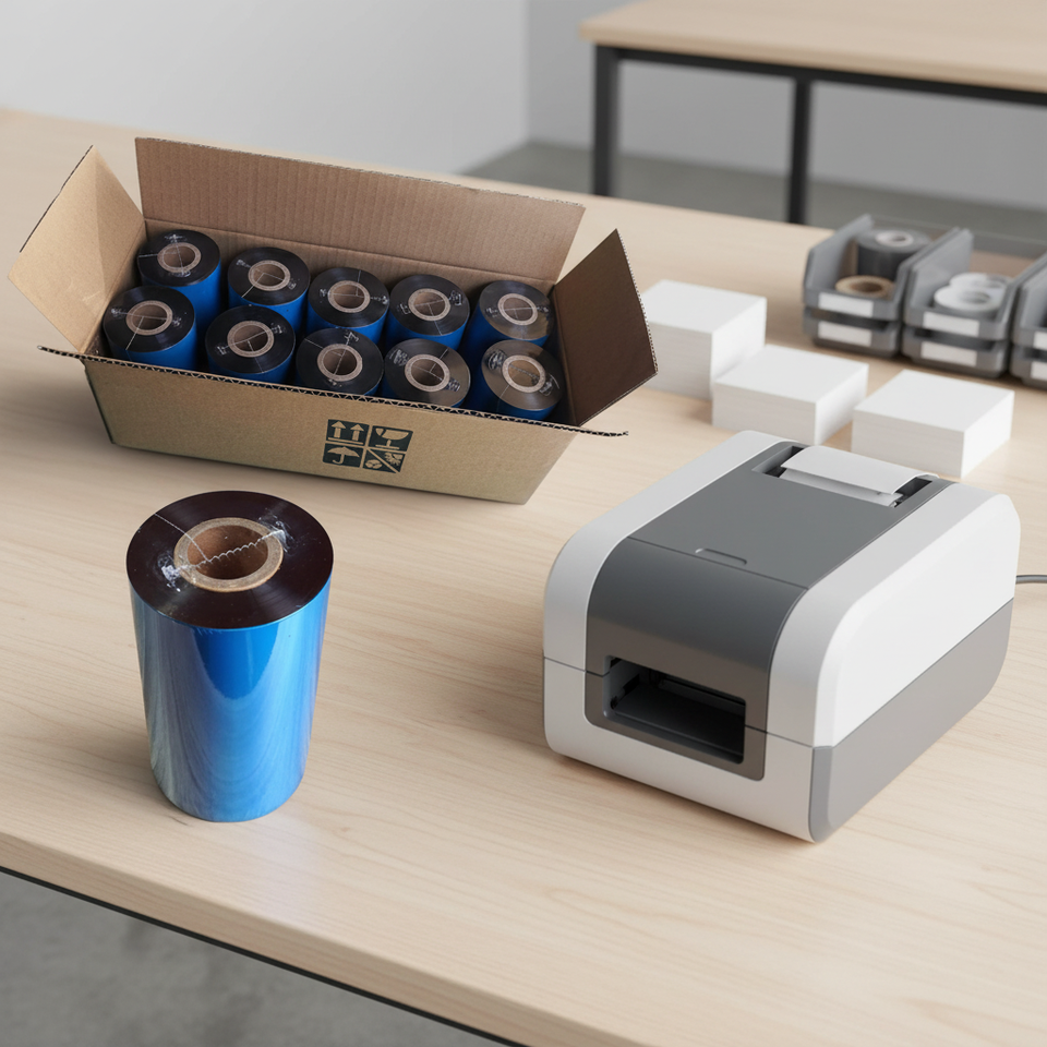 ริบบิ้นถ่ายโอนความร้อนขนาด 110 มม. x 300 ม. หมึกสีดำเคลือบแว็กซ์ แกนกลางขนาด 1 นิ้ว สำหรับพิมพ์ฉลากบาร์โค้ด
