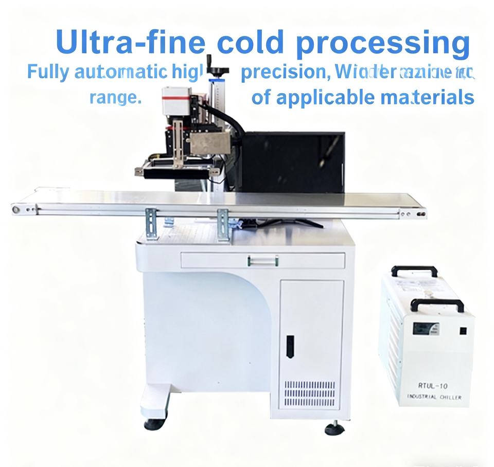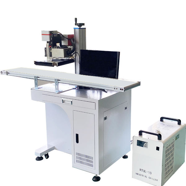 เครื่องเลเซอร์มาร์กกิ้ง UV 5W ขนาด 110x110 มม. พร้อมสายพานลำเลียงและกล้อง CCD ระบบระบุตำแหน่งแบบไดนามิกด้วยภาพ สำหรับการมาร์กกิ้งแบบเคลื่อนที่ พร้อมคอมพิวเตอร์