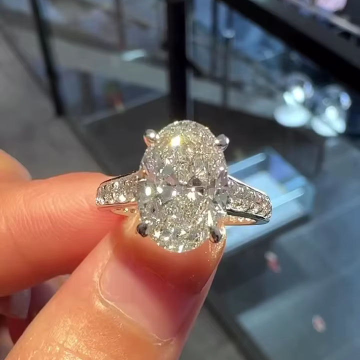 แหวนหมั้นเพชรมอยส์ซาไนต์ทรงรีขนาด11x8มม. แหวนที่ซ่อนอยู่ในรัศมีทองคำขาวชุบ925สีเงินเครื่องประดับงานแต่งงานแบบละเอียดสำหรับผู้หญิงขายส่ง