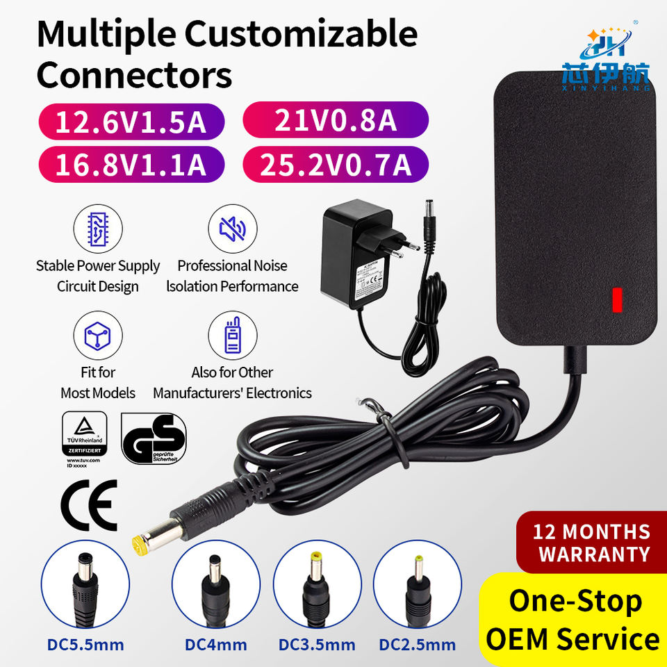 อะแดปเตอร์แปลงไฟ 12.6V/16.8V/21V/25.2V, ได้รับการรับรองมาตรฐาน CE/GS/TUV, หัวปลั๊ก DC หลายแบบ, รับประกัน 12 เดือน, บริการ OEM แบบครบวงจร