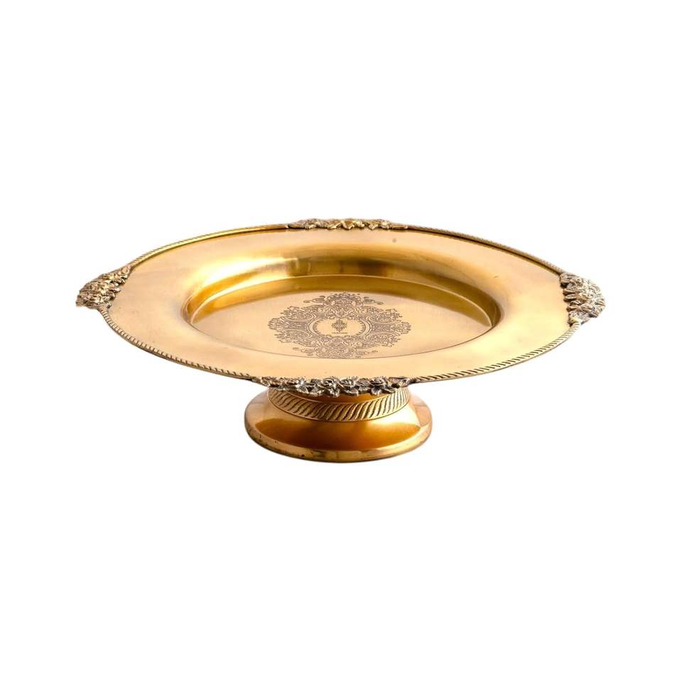 ถาดทองเหลืองแกะสลักลายดอกไม้ขนาด 12 นิ้ว สำหรับพิธีบูชาที่บ้านหรือวัด ถาดทองเหลืองสำหรับพิธีอัตตีร์ตี ของขวัญสำหรับพิธีบูชา สีทอง
