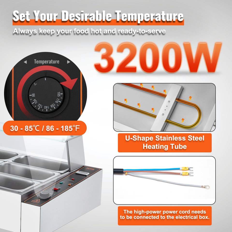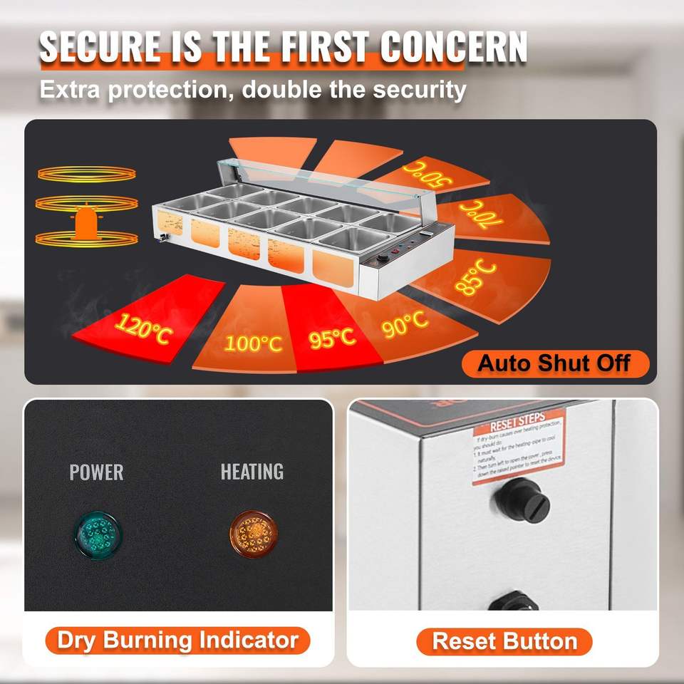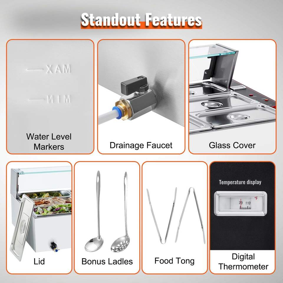 โต๊ะอุ่นอาหารสแตนเลสแบบตั้งโต๊ะ 12 ช่อง ขนาด 3200 วัตต์ พร้อมอุปกรณ์อุ่นอาหารแบบกระจก 12 ช่อง ความจุ 5 ควอร์ต