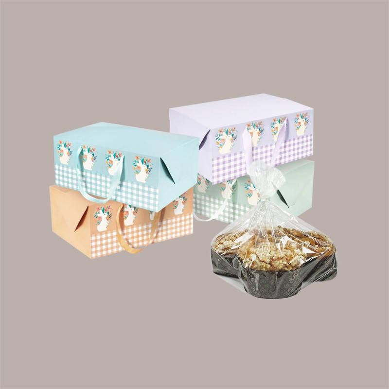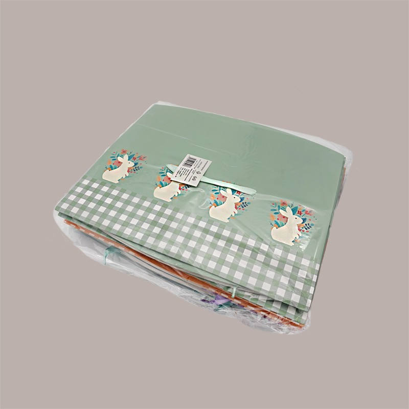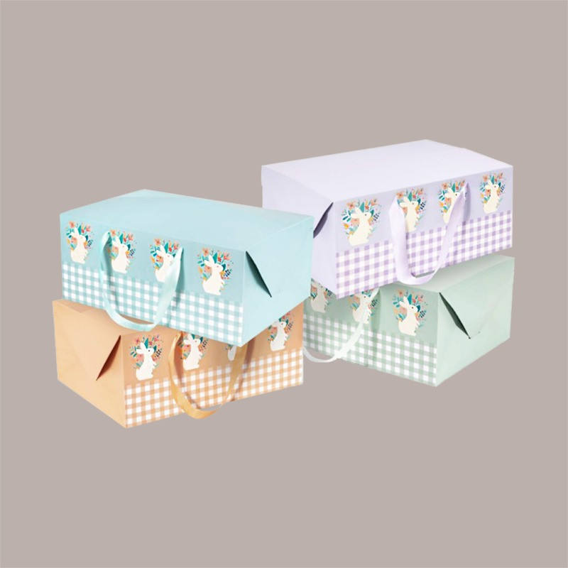กล่องใส่ของแบบมีหูหิ้ว 12 ชิ้น ลายตารางผสม ขนาด 33.5 + 23.5 + สูง 14 ซม. พิมพ์สี่สี ทำจากกระดาษแข็ง
