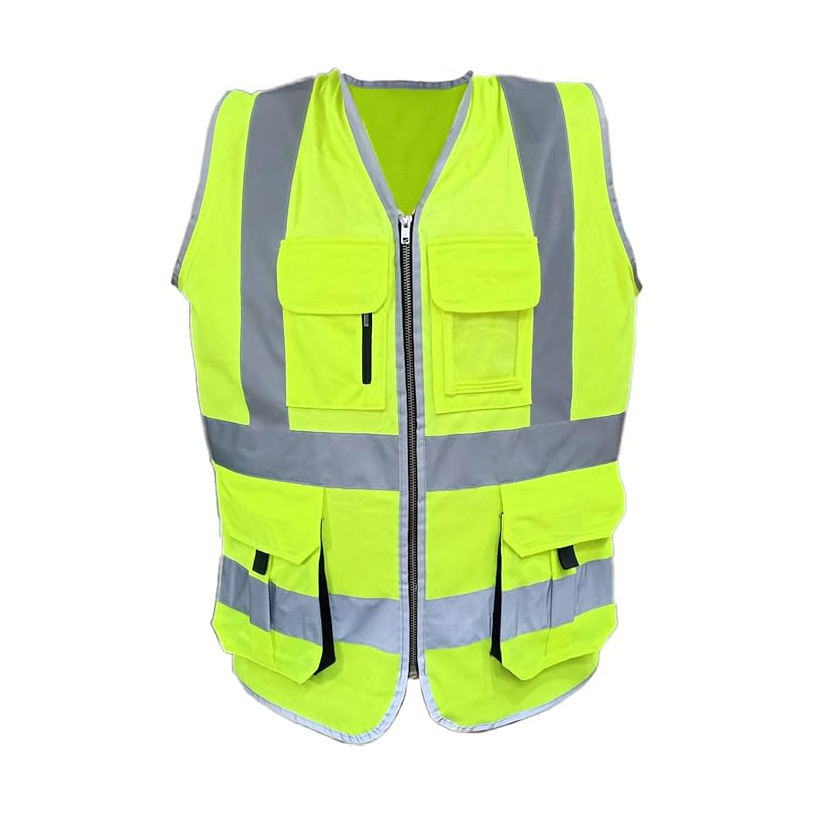 เสื้อกั๊กนิรภัย 12 กระเป๋า สีเหลืองมะนาว ANSI Class 3 ผ้าโพลีเอสเตอร์ตาข่าย ติดกระดุมด้านหน้า พร้อมช่องใส่เครื่องวิทยุและช่องใส่บัตร