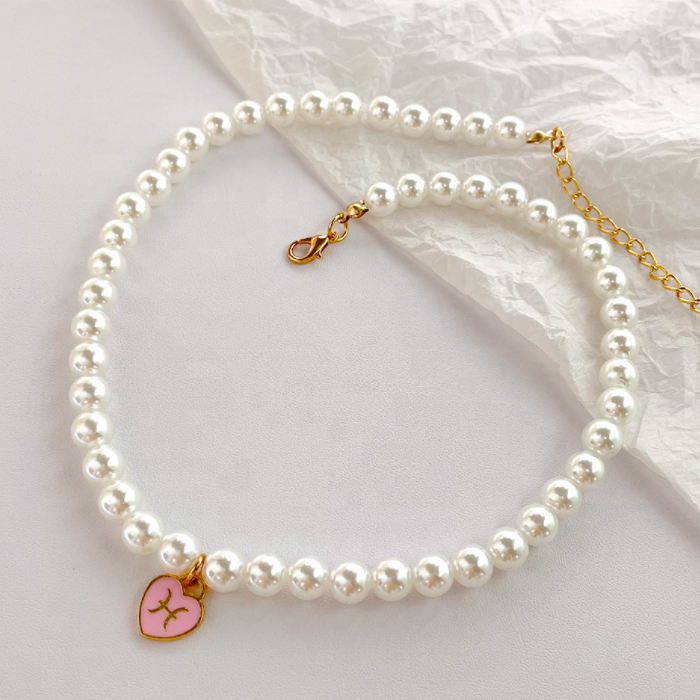 สร้อยคอดีไซน์ใหม่12ราศีสำหรับผู้หญิงจี้หัวใจสีชมพูเคลือบแฟชั่น12ราศีประดับด้วยลูกปัดไข่มุกสร้อยคอโชกเกอร์สำหรับผู้หญิง