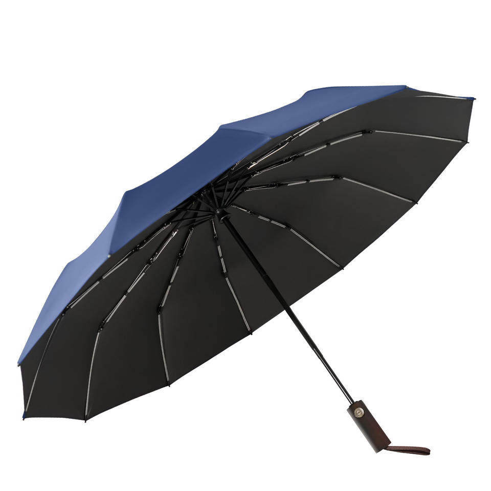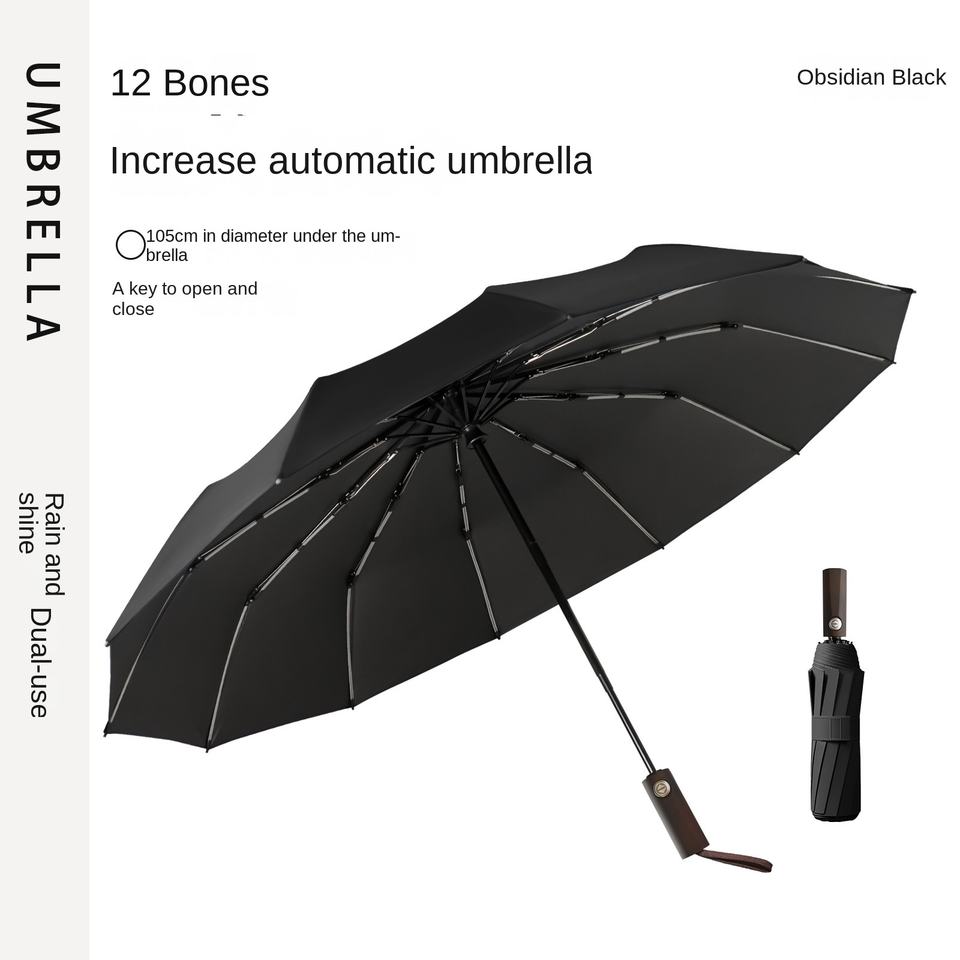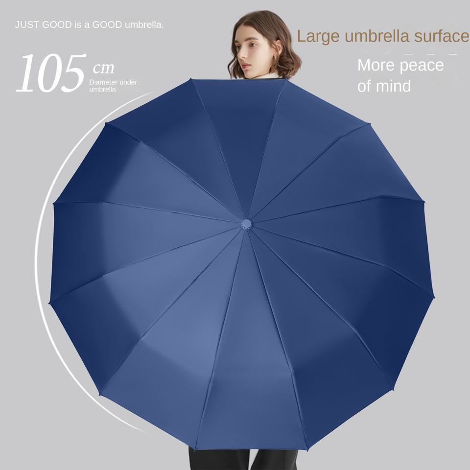 ร่มกันแดดกันฝนอัตโนมัติแบบพับสามตอน โครงเหล็ก 12 ซี่ สีดำเคลือบกาว ป้องกันรังสียูวี ใช้ได้ทั้งกันแดดและกันฝน ผู้ผลิตรับพิมพ์ลายตามสั่ง
