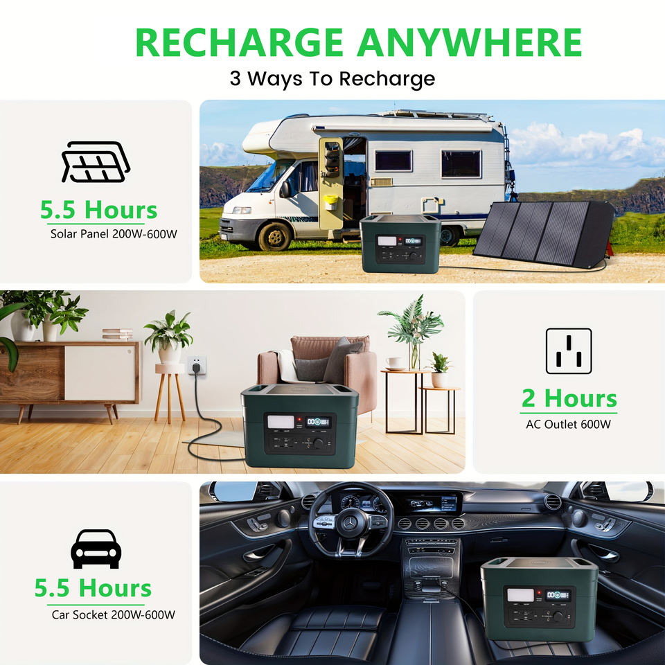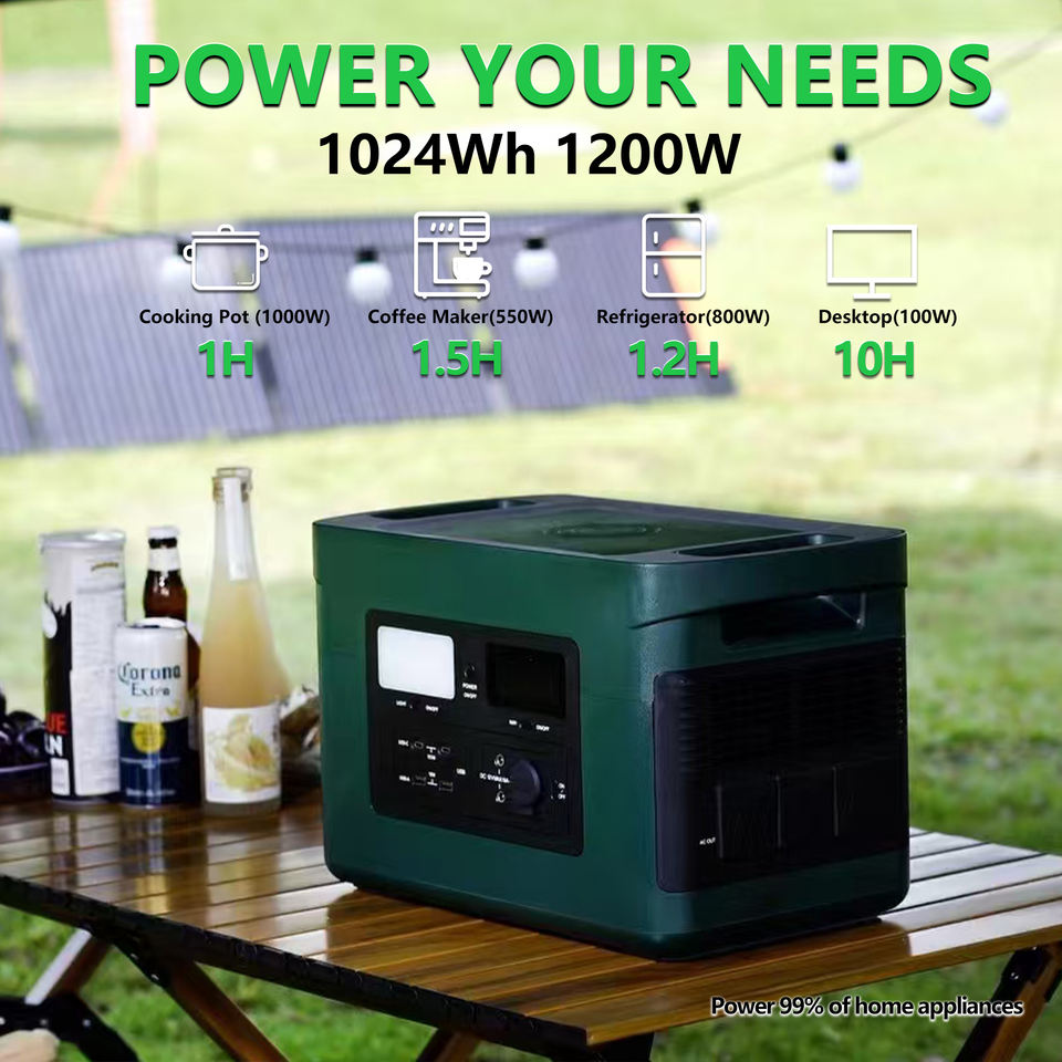 สถานีพลังงานแสงอาทิตย์ 1200W 1024Wh เครื่องกำเนิดไฟฟ้าสำหรับใช้งานกลางแจ้ง พร้อมไฟฉาย LED ชาร์จไร้สาย ช่องเสียบไฟ AC สำหรับใช้ในบ้าน กรณีไฟดับ และการเดินทาง