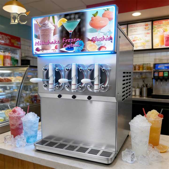 เครื่องทำน้ำแข็งปั่น 120 ลิตร/ชม. 3 ถัง แบบตั้ง - เครื่องทำมาร์การิต้าแบบมืออาชีพสำหรับขายเครื่องดื่มแช่แข็ง ขนมขบเคี้ยว เครื่องทำน้ำแข็งปั่นเรนโบว์ 11 ลิตร