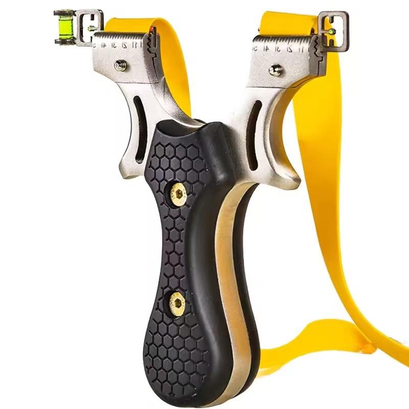 หนังสติ๊กสแตนเลสสีดำขนาด 120 มม. ความแม่นยำสูง พร้อมสายหนังแบน แรงดันเร็ว สำหรับการล่าสัตว์กลางแจ้ง