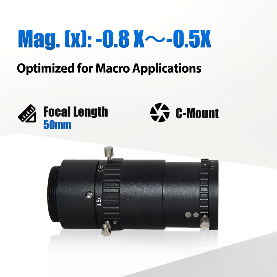 12MP 1.1 "50mm เลนส์คงที่ขยาย-0.8x-0.5x การตรวจสอบเลนส์มาโครที่ไร้รอยต่อสำหรับการถ่ายภาพที่แม่นยำสูง
