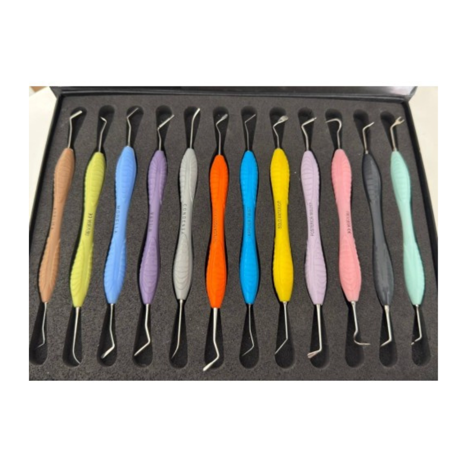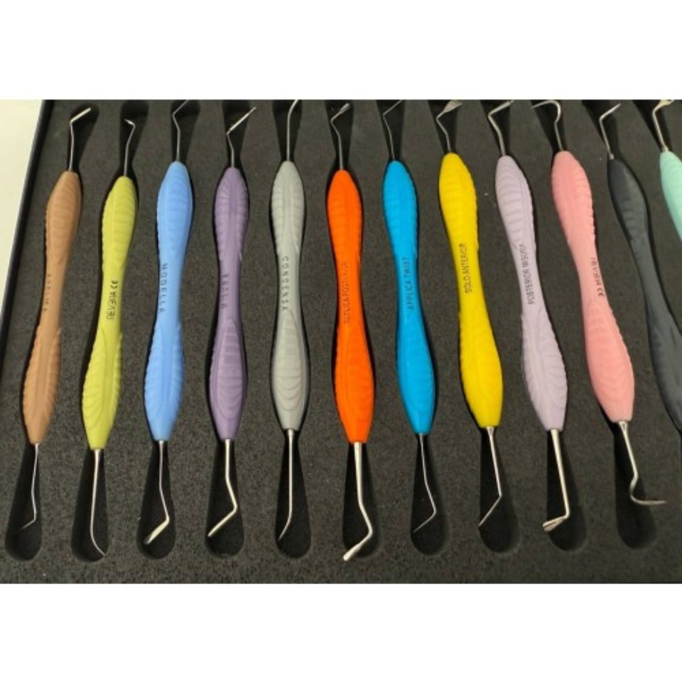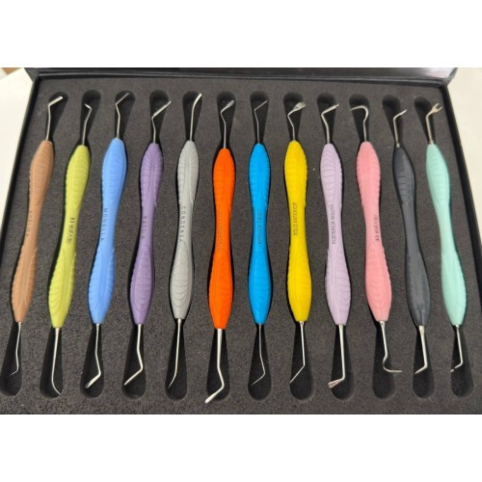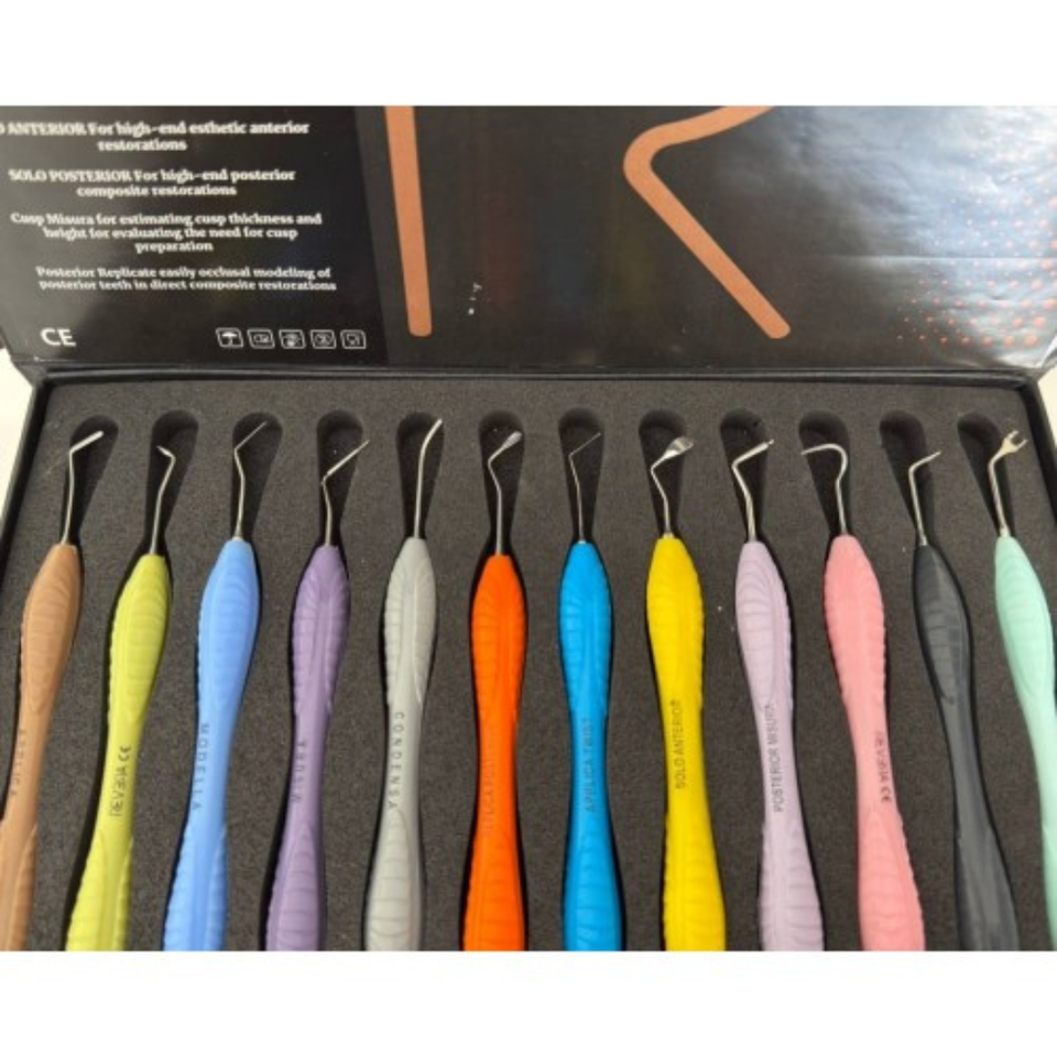 ชุดอุปกรณ์อุดฟันคอมโพสิต 12 ชิ้น พร้อมด้ามจับซิลิโคน Ergomax แบบใช้มือสำหรับงานบูรณะฟัน ปลายสองด้าน ใช้ซ้ำได้ บรรจุในตลับ