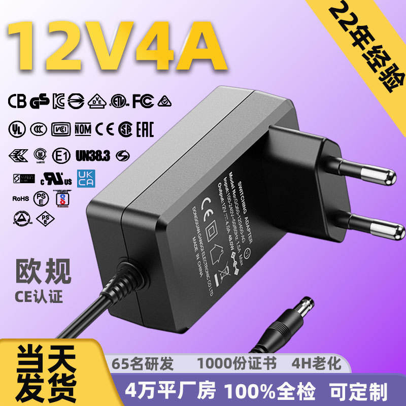 อะแดปเตอร์แปลงไฟมาตรฐานยุโรป 12V 4A 48W แหล่งจ่ายไฟกำลังสูงสำหรับเครื่องนวดบอร์ดโฆษณาได้รับการรับรอง CE เป็นมิตรกับสิ่งแวดล้อม