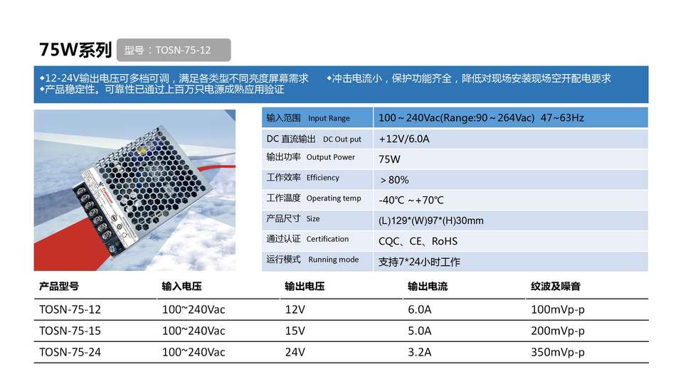 12V 6A 75W แหล่งจ่ายไฟ tosn-75-12เหมาะสำหรับหน้าจอเชิงพาณิชย์