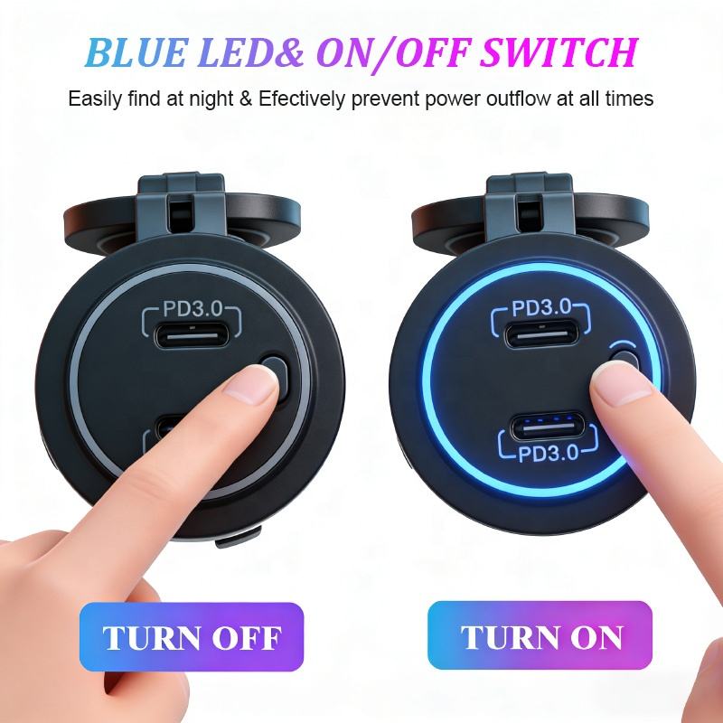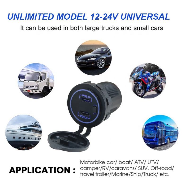 เครื่องชาร์จ USB แบบคู่ 12V พร้อมพอร์ต PD 2 ช่อง ปุ่มเปิด/ปิด ไฟ LED ดีไซน์ใหม่สไตล์จีน