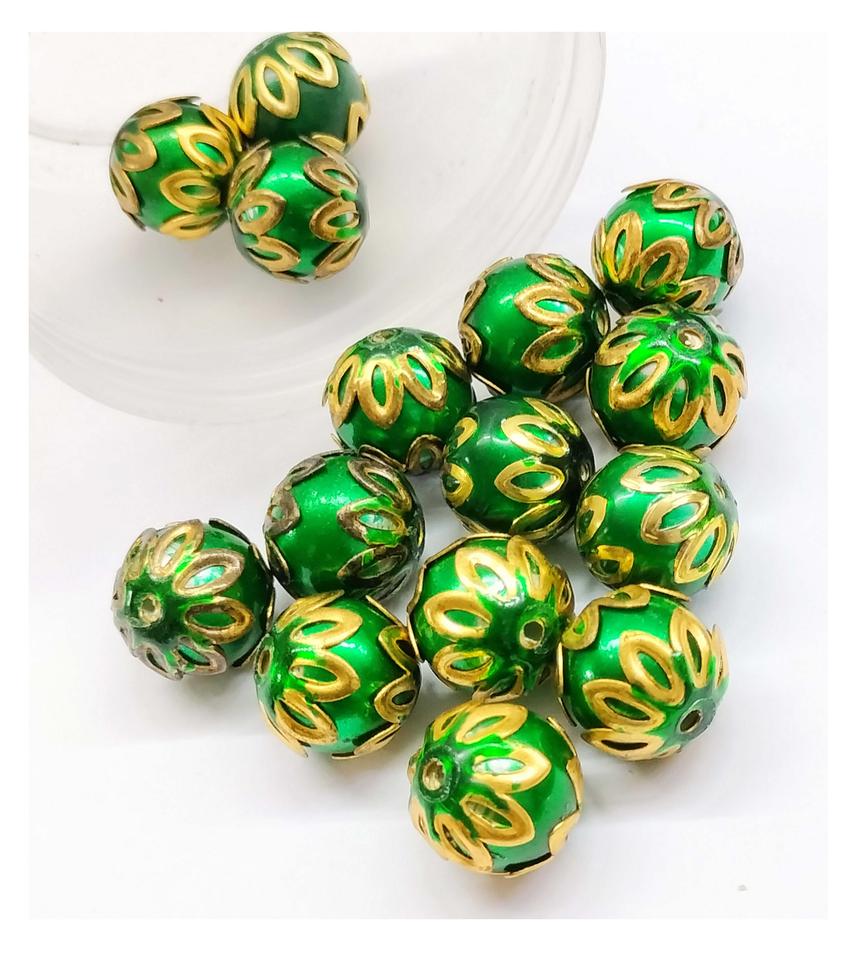 12mm Dark Green Lotus Glass Beads with Antique Gold Petal Design Round Decorative Beads for Jewelry & Craft