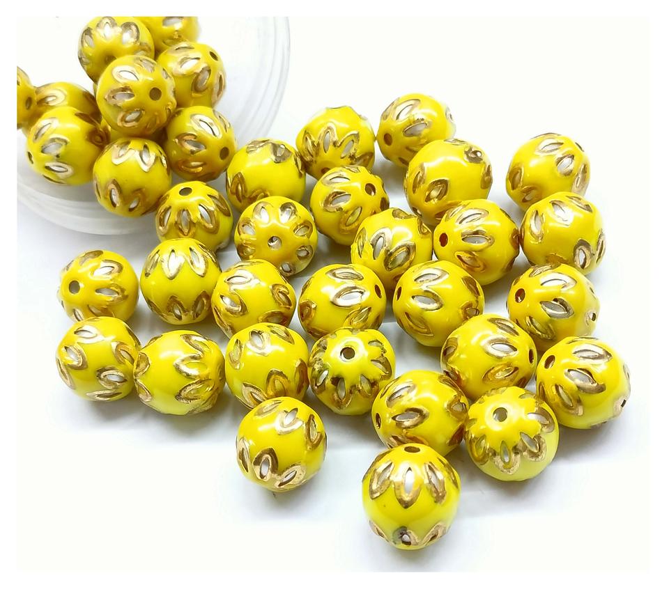 ลูกปัดแก้วดอกบัวสีเหลืองขนาด12มม. พร้อมเม็ดกลมสีทองสำหรับงานหัตถกรรมและงานปัก