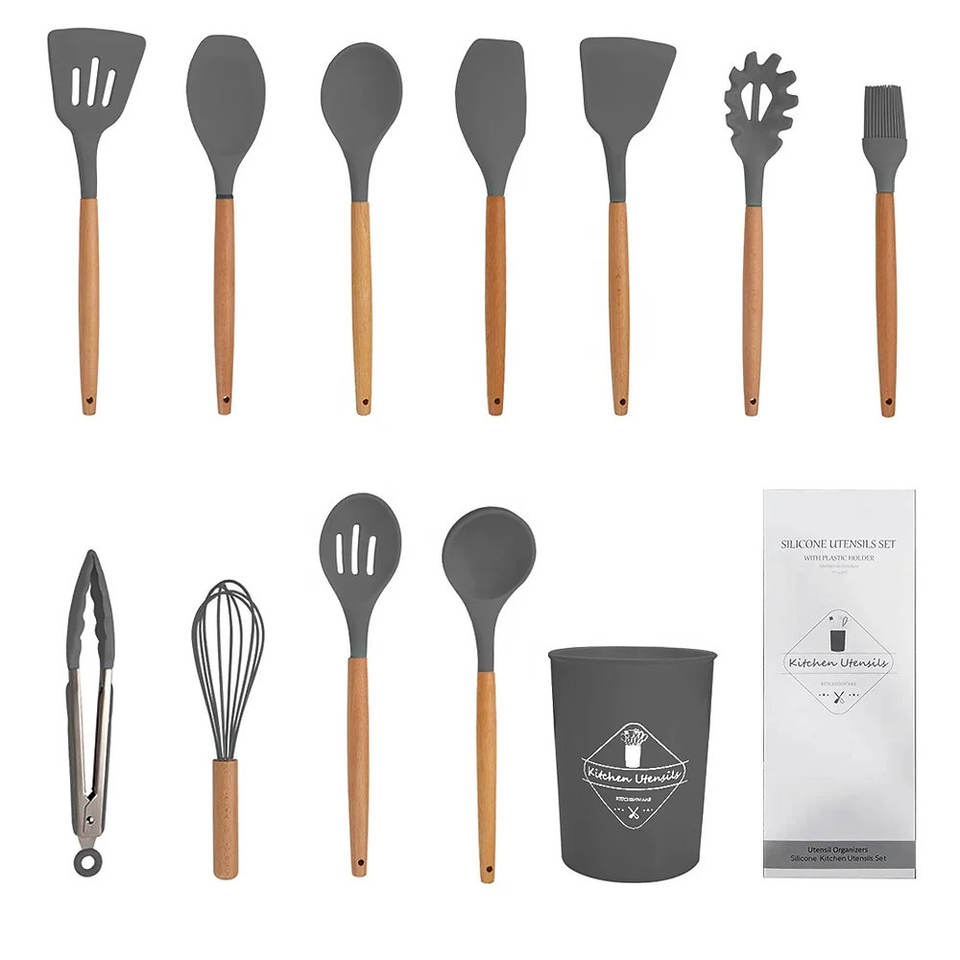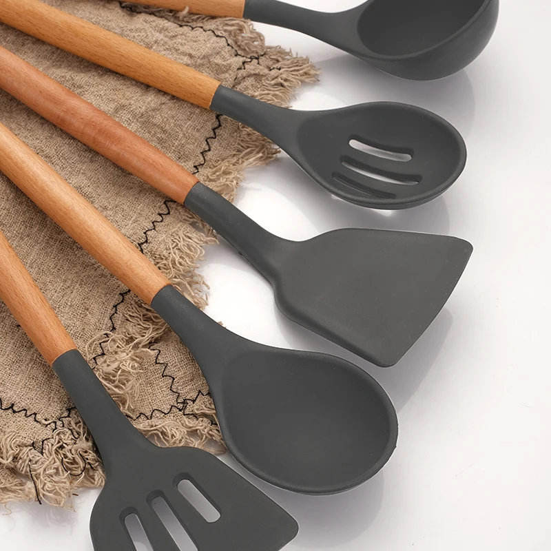 ชุดอุปกรณ์ครัวซิลิโคนรักษ์โลก 12 ชิ้น ด้ามไม้ ทนความร้อนสูง ใช้กับเตาอบได้ ล้างมือเท่านั้น บรรจุกล่องอย่างดี