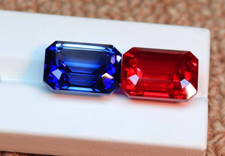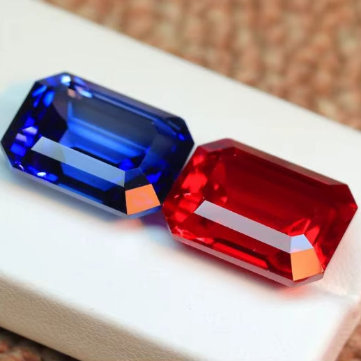 พลอยแซฟไฟร์สีน้ำเงินและพลอยทับทิมสีแดงทรงเหลี่ยมมรกต ขนาด 12x10 มม. ผลิตในห้องปฏิบัติการ - พลอยคุณภาพเยี่ยมสำหรับทำเครื่องประดับ