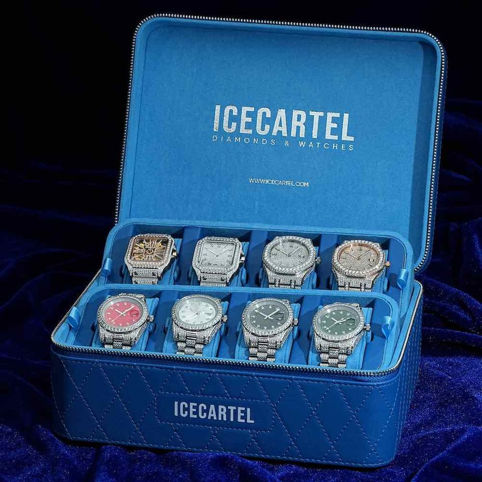นาฬิกาข้อมือผู้บริหารประดับเพชรโมอิสซาไนต์สีน้ำเงิน 13.3 กะรัต ขนาด 41 มม. ตัวเรือนสแตนเลสทรงกลม ฐานทองคำขาว 14K ประดับเพชรเต็มหน้าปัด