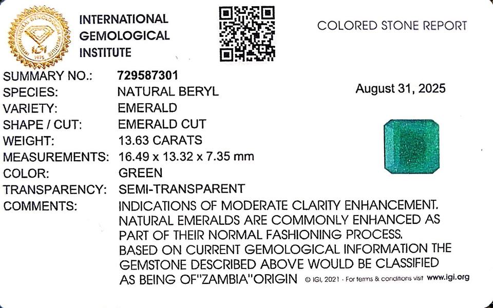 มรกตสีเขียวทรงแปดเหลี่ยม 13.63 กะรัต จากแซมเบีย พลอยหลวม