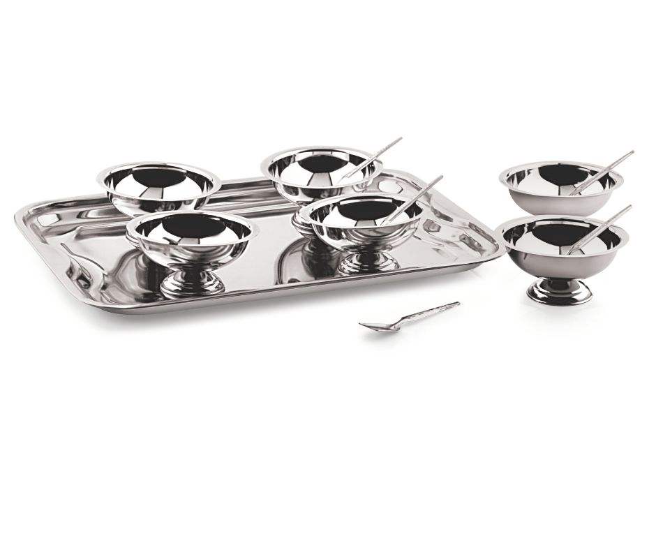 ชามโลหะสำหรับเสิร์ฟไอศกรีมจัมโบ้สแตนเลส13ชิ้นพร้อมถาดและช้อน