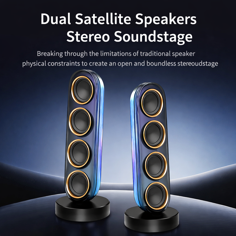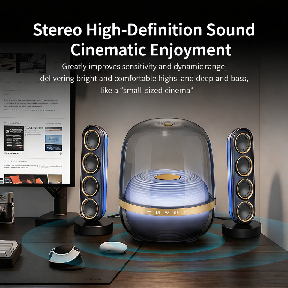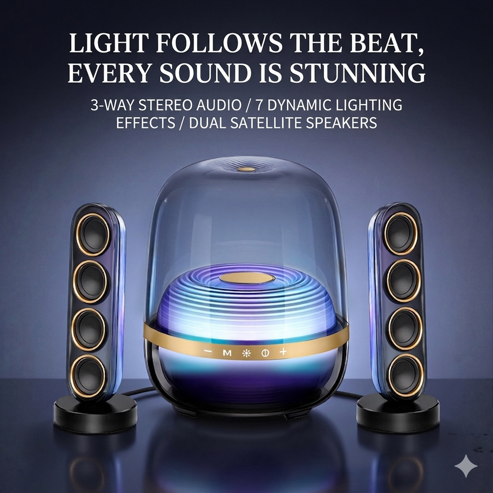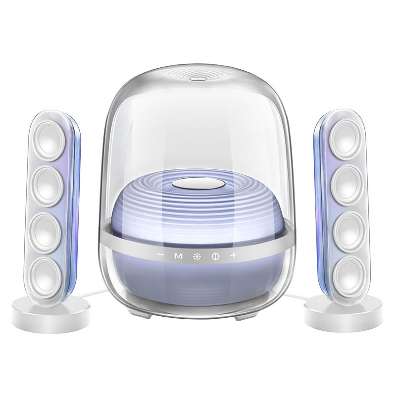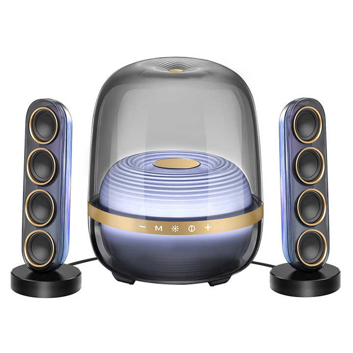 ลำโพงไร้สายโปร่งใส 130W 2.1 พร้อมซับวูฟเฟอร์แบบแอคทีฟ, ลำโพงแซทเทิลไลท์คู่, 360 ° เอฟเฟกต์แสง RGB ซิงค์กับจังหวะ