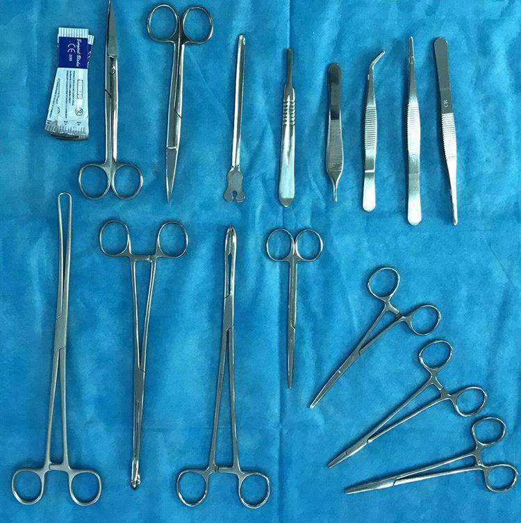 ชุดฝึกหัดเย็บแผลสำหรับนักศึกษาแพทย์และสัตวแพทย์ 13 ชิ้น ประกอบด้วยกรรไกรสแตนเลส คีมจับเข็ม และอุปกรณ์อื่นๆ จากบริษัท Blush surgical