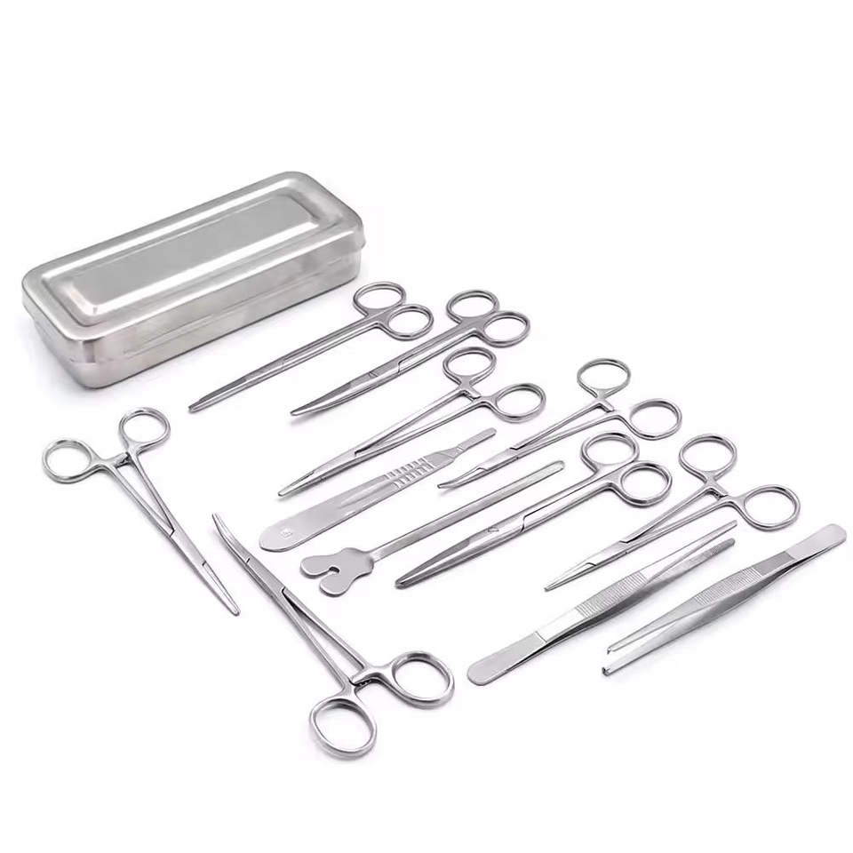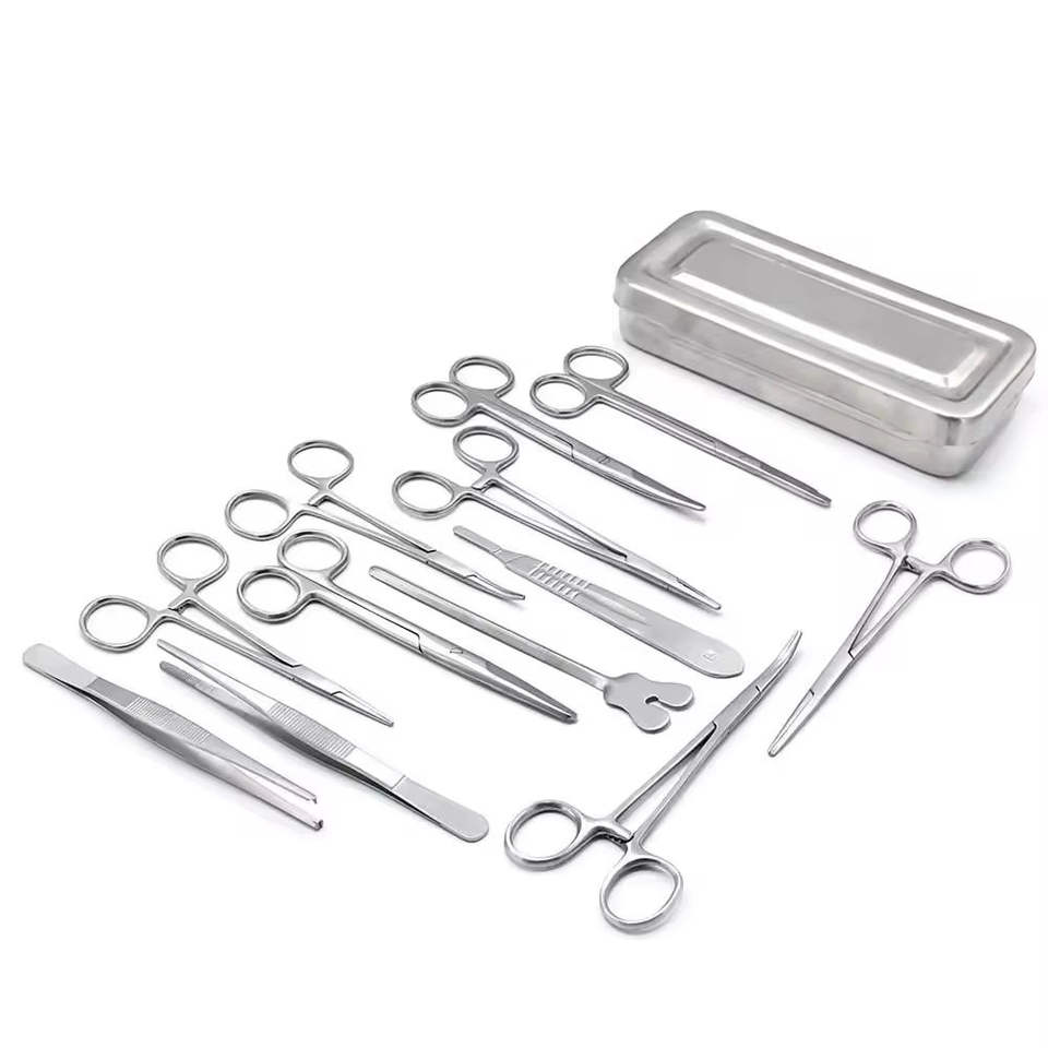 ชุดเครื่องมือผ่าตัดเล็กแบบใช้มือ 13 ชิ้น ทำจากเหล็กกล้าไร้สนิม บรรจุในกล่อง ประกอบด้วยกรรไกร คีมจับ เข็มจับ ได้รับการรับรองมาตรฐาน CE ISO13485 รับประกัน 1 ปี
