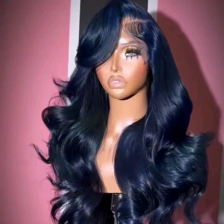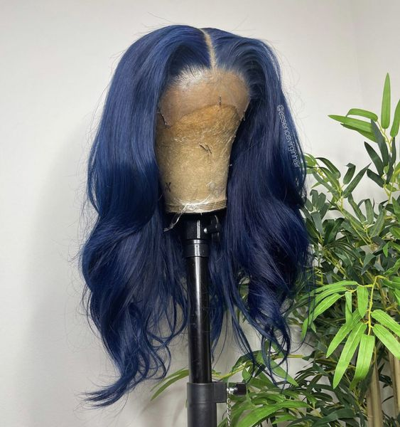 วิกผมแท้แบบไม่ต้องใช้กาว ขนาด 13x4 พร้อมเชือกผูกแบบใส 5x5 สีน้ำเงินกรมท่า ผมยาว แบบถอนขนแล้ว ลอนคลาย ผสมสีผม