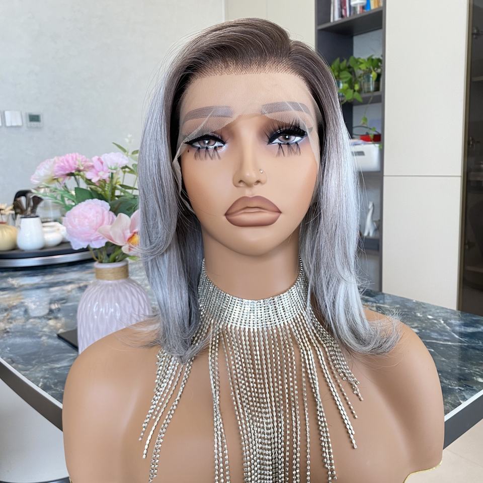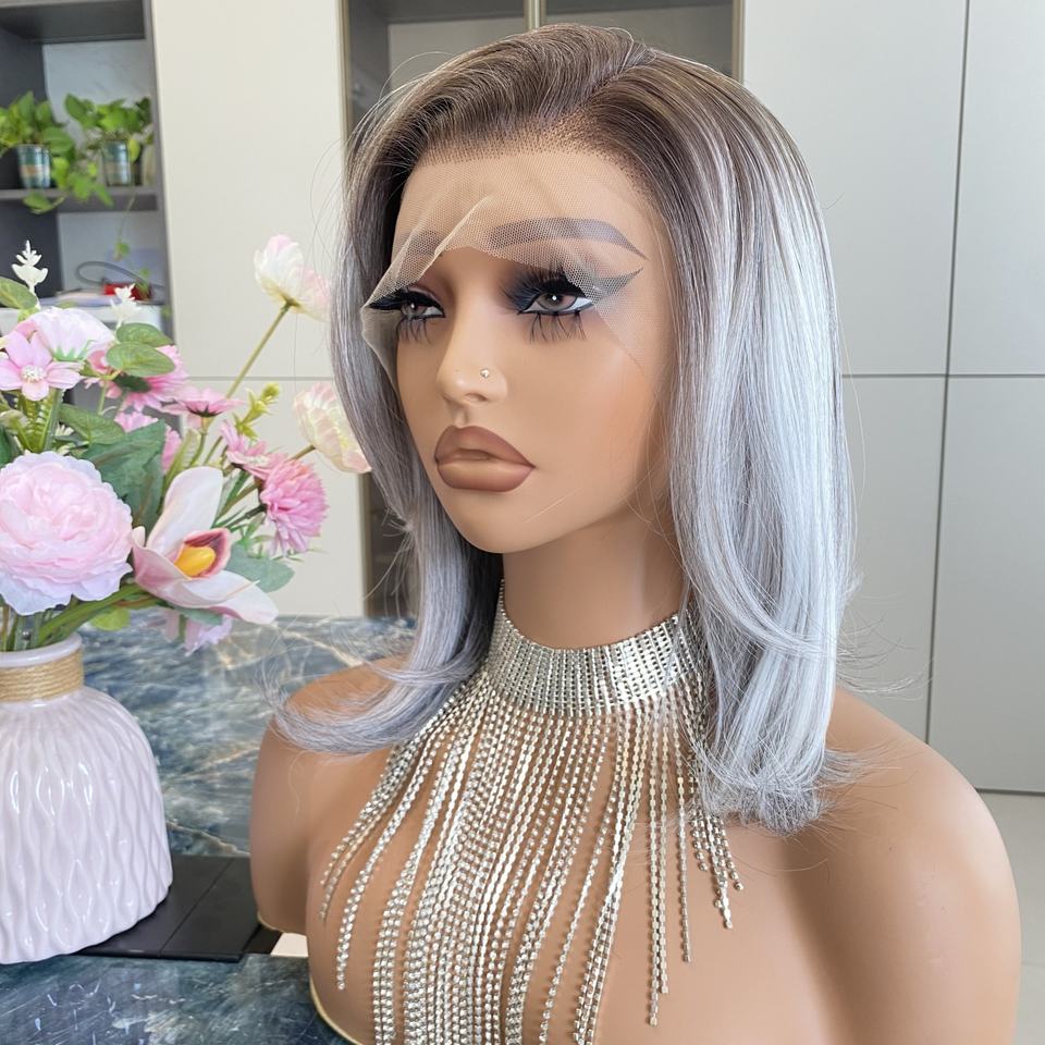 วิกผมสังเคราะห์แบบลูกไม้ด้านหน้า 13x4 สีเทาเงินผสม ทรงบ็อบแบบลอน ไม่ต้องใช้กาว ทนความร้อน ปรับได้ พร้อมหมวกวิกแบบลูกไม้โปร่งใส