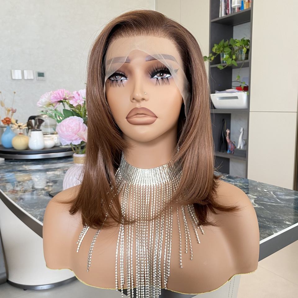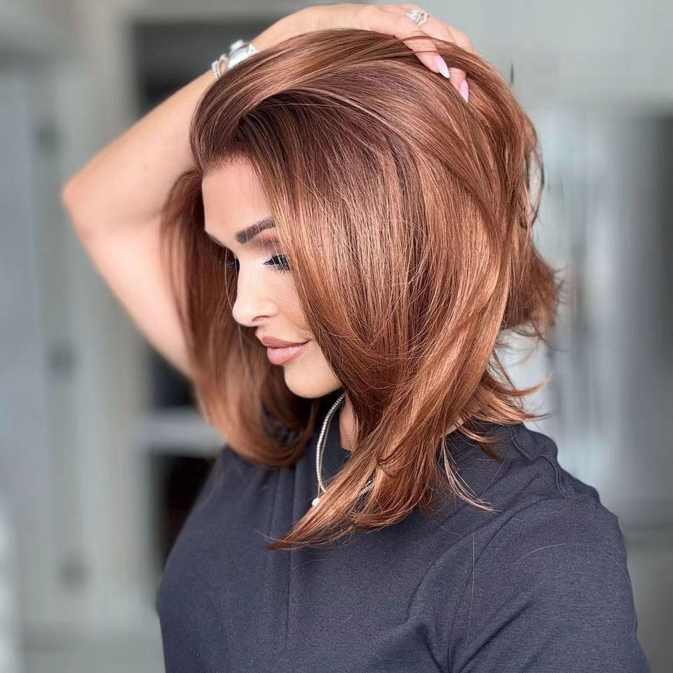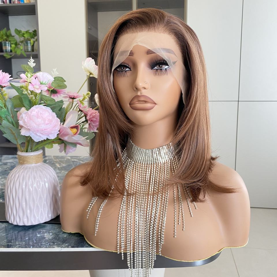 วิกผมสังเคราะห์แบบลูกไม้ 13x4 สีน้ำตาลทองแดง ทรงบ็อบ ลอนคลื่น ทนความร้อน ไรผมธรรมชาติ ฐานลูกไม้โปร่งใส ไม่ต้องใช้กาว