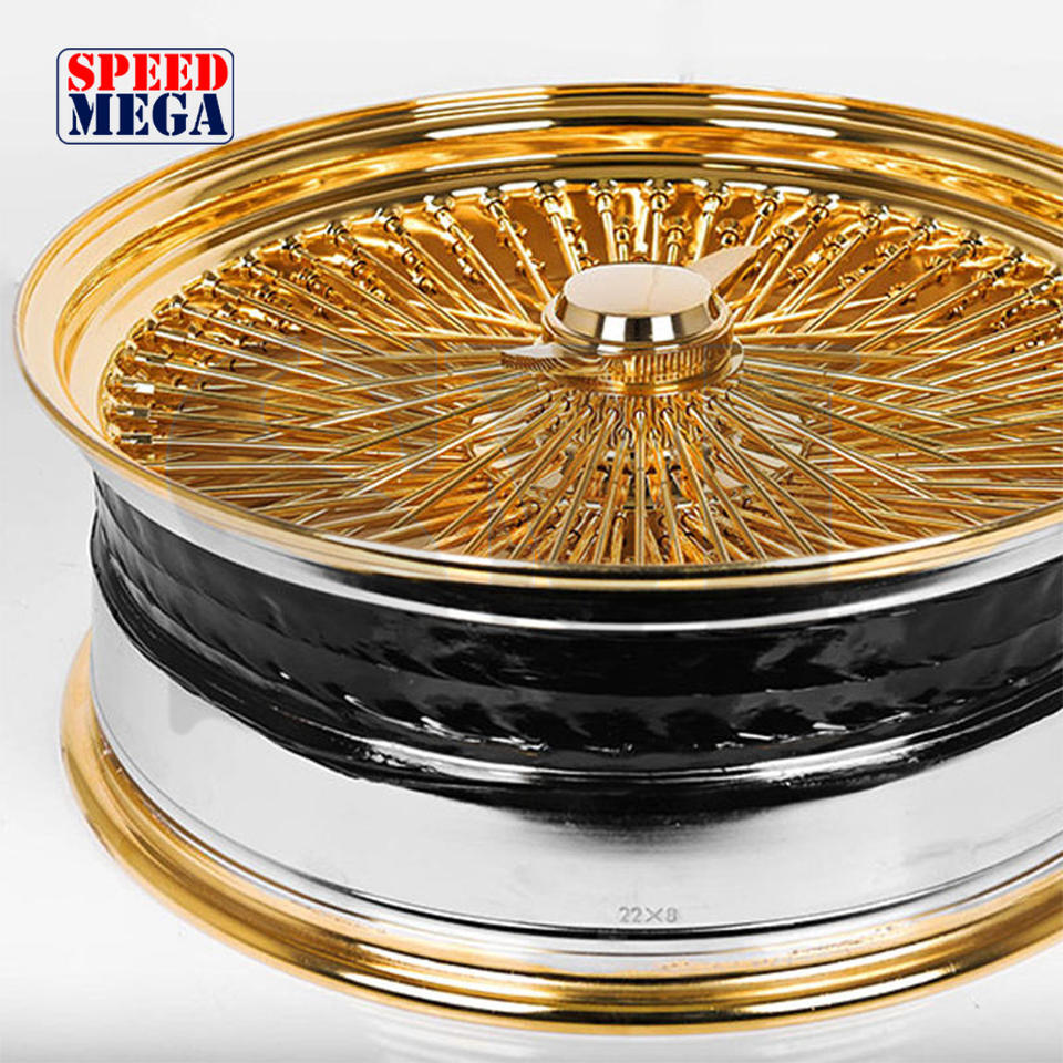 ล้อแม็กซ์ 13x7 ขอบ 100/72 5x114.3 โครเมียม ล้อหน้าและล้อซี่ลวด ความกว้างต่างกัน ล้อซี่ลวดสีทอง ไม่มียาง