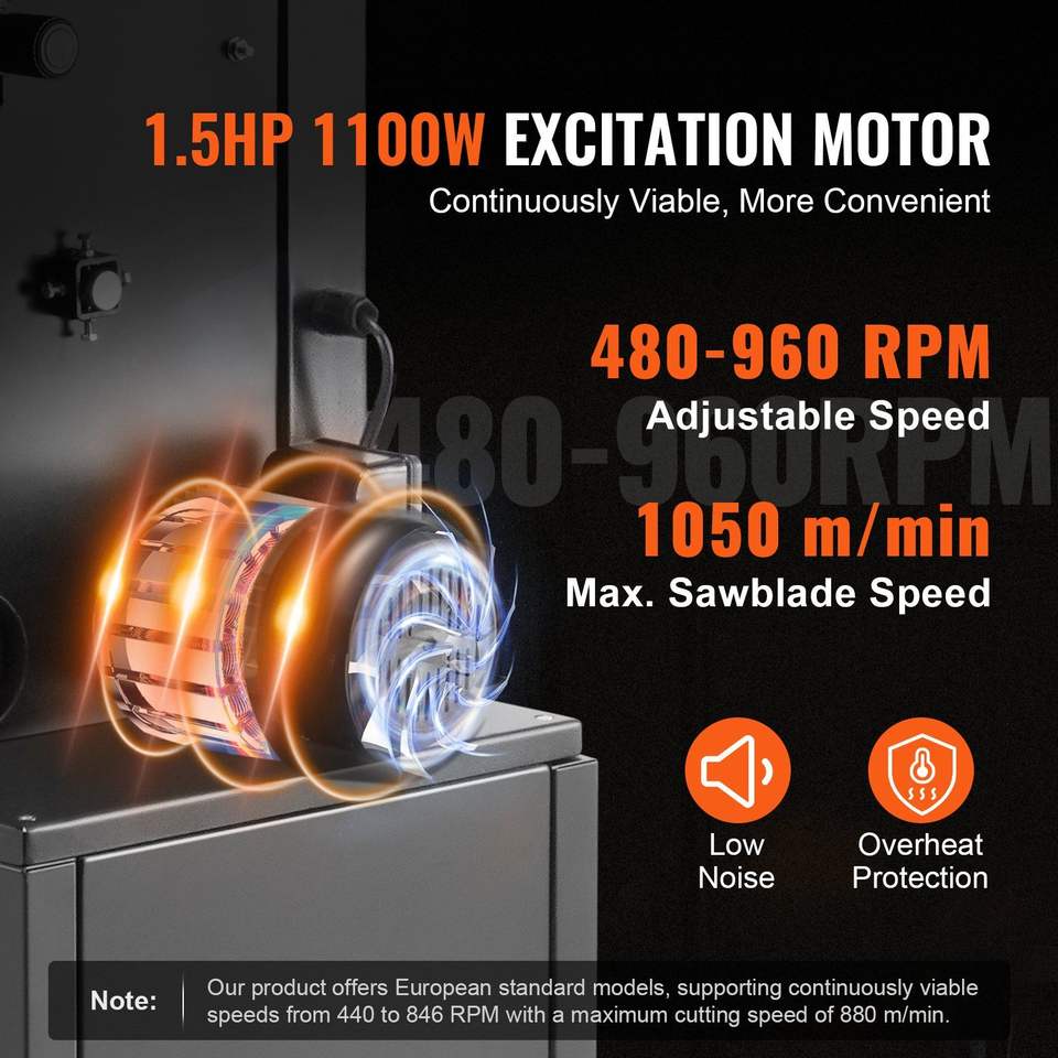 เครื่องเลื่อยสายพานแบบตั้งโต๊ะขนาด 14 นิ้ว 1100 วัตต์ 1-1/2 แรงม้า ความเร็ว 480-960 รอบต่อนาที พร้อมไฟทำงานที่ปรับได้เพื่อการใช้งานบนโต๊ะทำงานได้ง่าย
