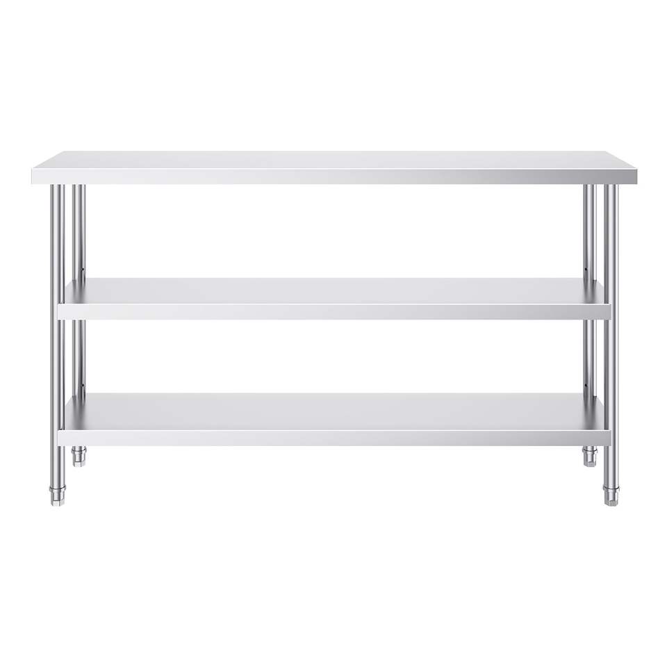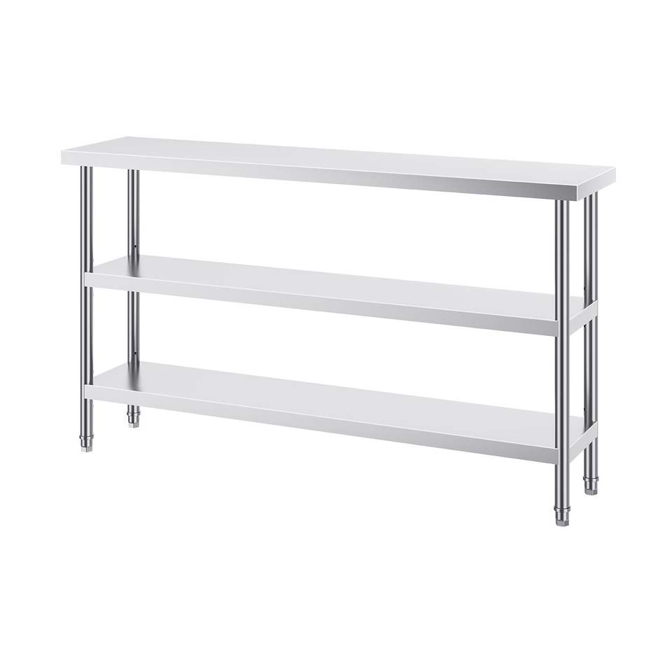 โต๊ะเตรียมอาหารสแตนเลสสำหรับครัวเชิงพาณิชย์ ขนาด 14 x 60 x 34 นิ้ว พร้อมชั้นวางด้านล่างปรับระดับได้ 2 ชั้น รับน้ำหนักได้มาก